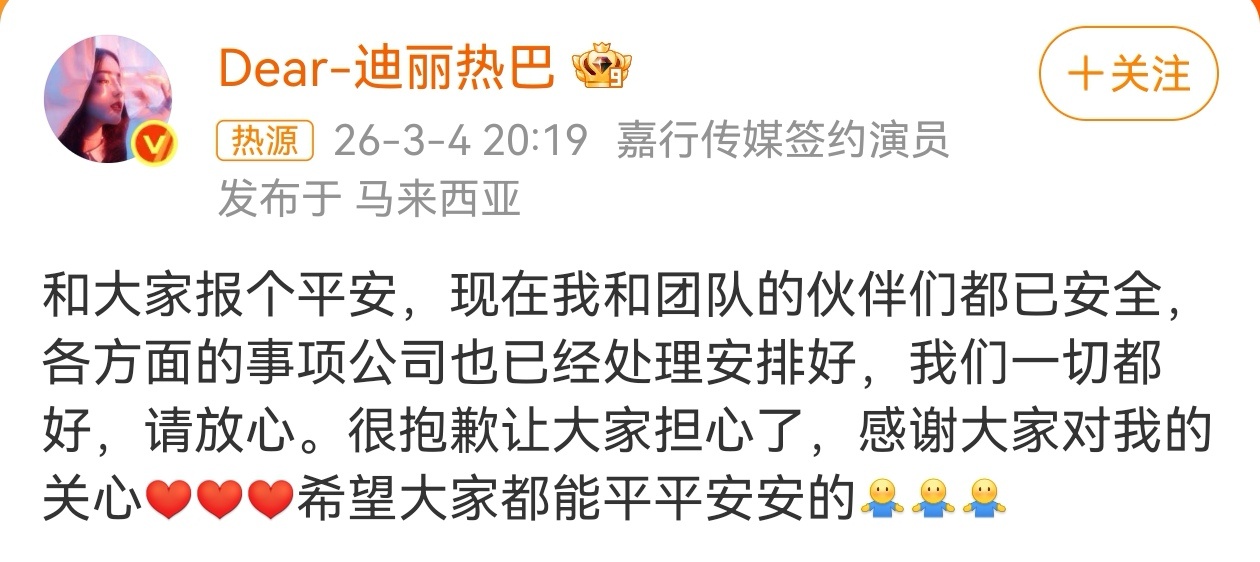随着中东局势乱成一锅粥,局势一天比一天紧张,战争面前,即便是明星也不能幸免,迪丽热巴因中东冲突升级原因滞留迪拜超72小时,错过了出席巴黎时装周,而团队其他成员却能直飞巴黎,直到迪丽热巴报平安,IP地址显示为马来西亚,粉丝才放心,IP在北京的工作室账号随后转帖报平安。迪丽热巴工作室中东局势彻底失控