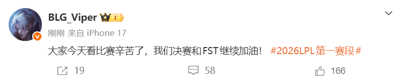 虎扑03月04日讯今日BLG击败JDG挺进先锋赛,赛后Viper更新社媒,具体如下: