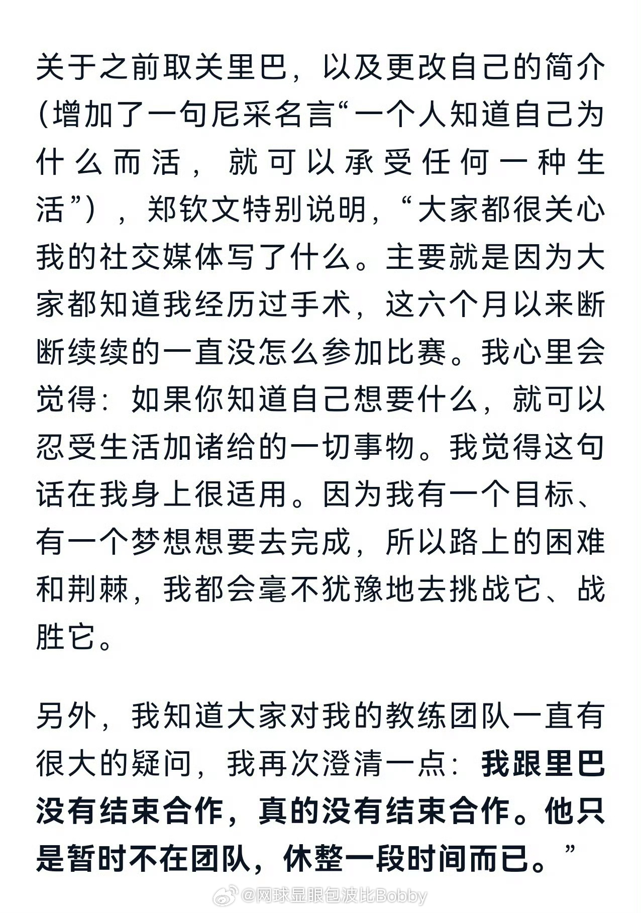 郑钦文澄清并没有和里巴结束合作💥