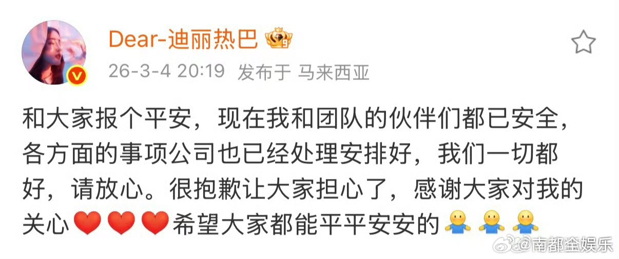 迪丽热巴报平安今晚,迪丽热巴发文报平安:“和大家报个平安,现在我和团队的伙伴们都已安全,各方面的事项公司也已经处理安排好,我们一切都好,请放心。很抱歉让大家担心了,感谢大家对我的关心,希望大家都能平平安安的” 迪丽热巴被曝滞留中东