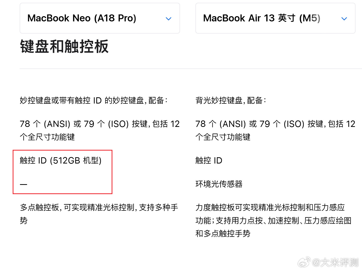 Macbook Neo 4599版本没有指纹解锁,仅限512GB有TouchID,电池容量这块要比Macbook Air小许多,一个36.5Wh(实际充电功率不知道是不是20W,产品页面上只写了个20W适配器),一个是53.8Wh(支持高功率PD快充)。 苹果发布会MacBook Neo
