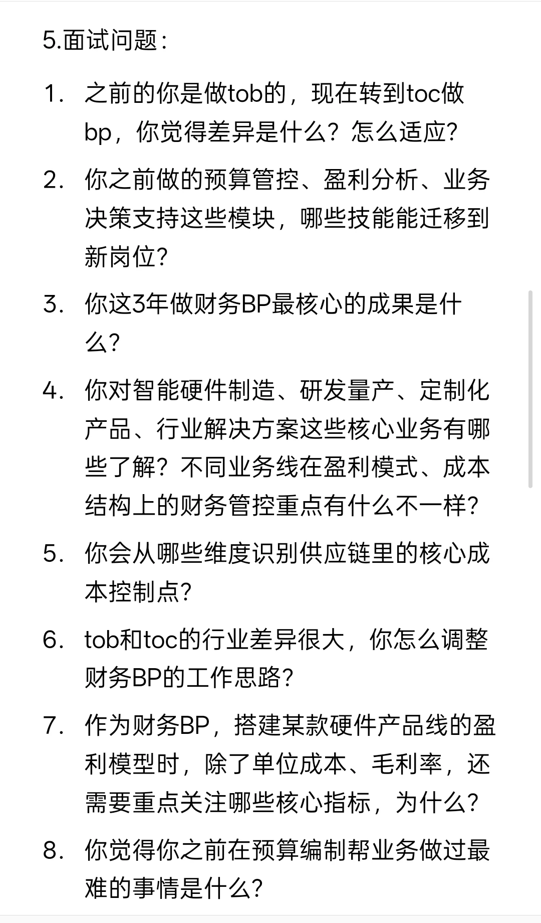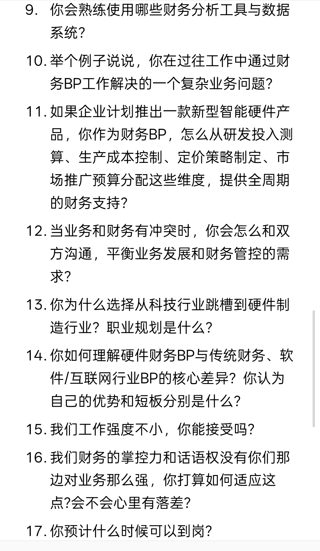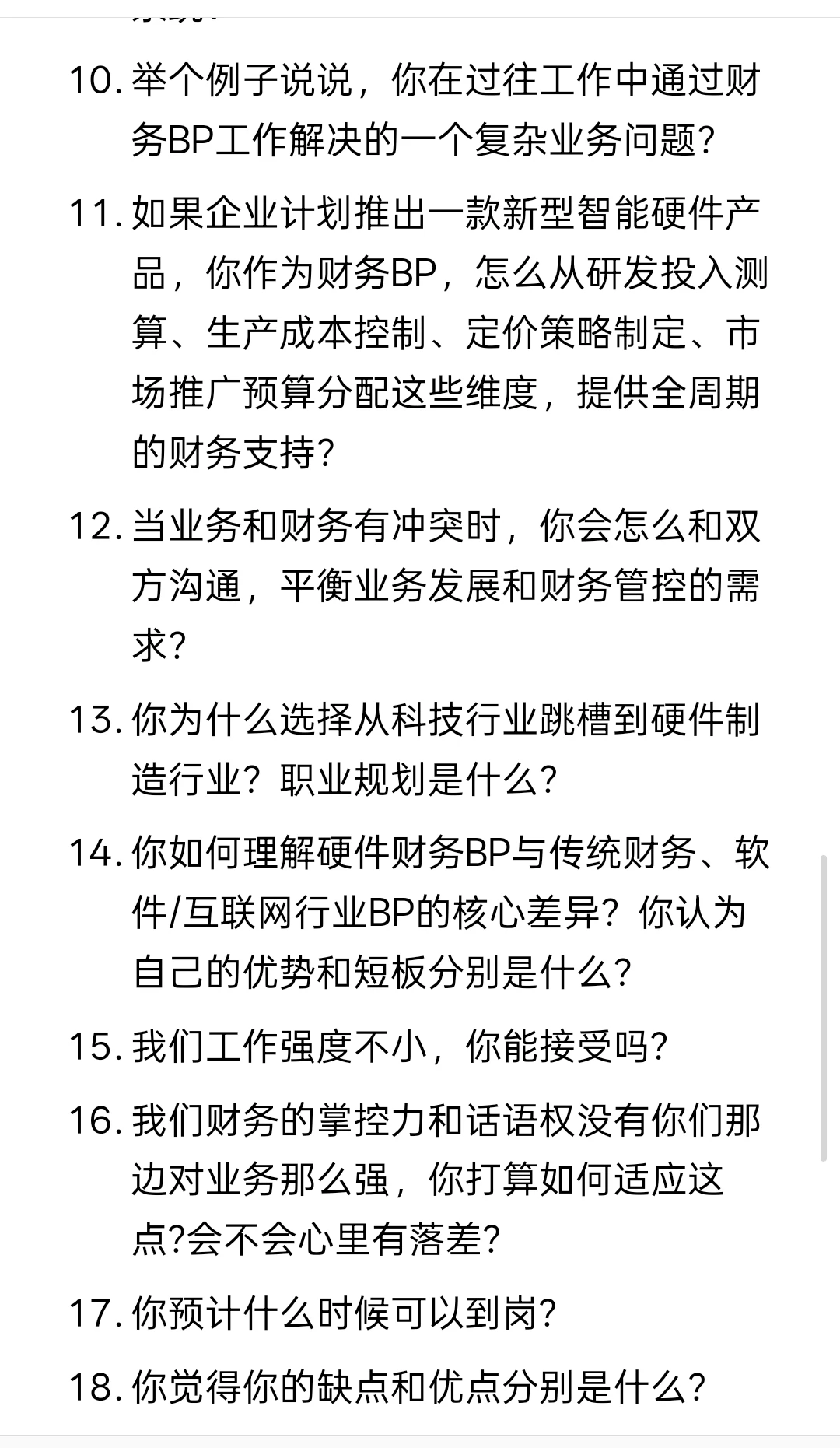 14. 你如何理解硬件财务BP与传统财务、软件/互联网行业BP的核心差异?你认为自己的优势和短板分别是什么?