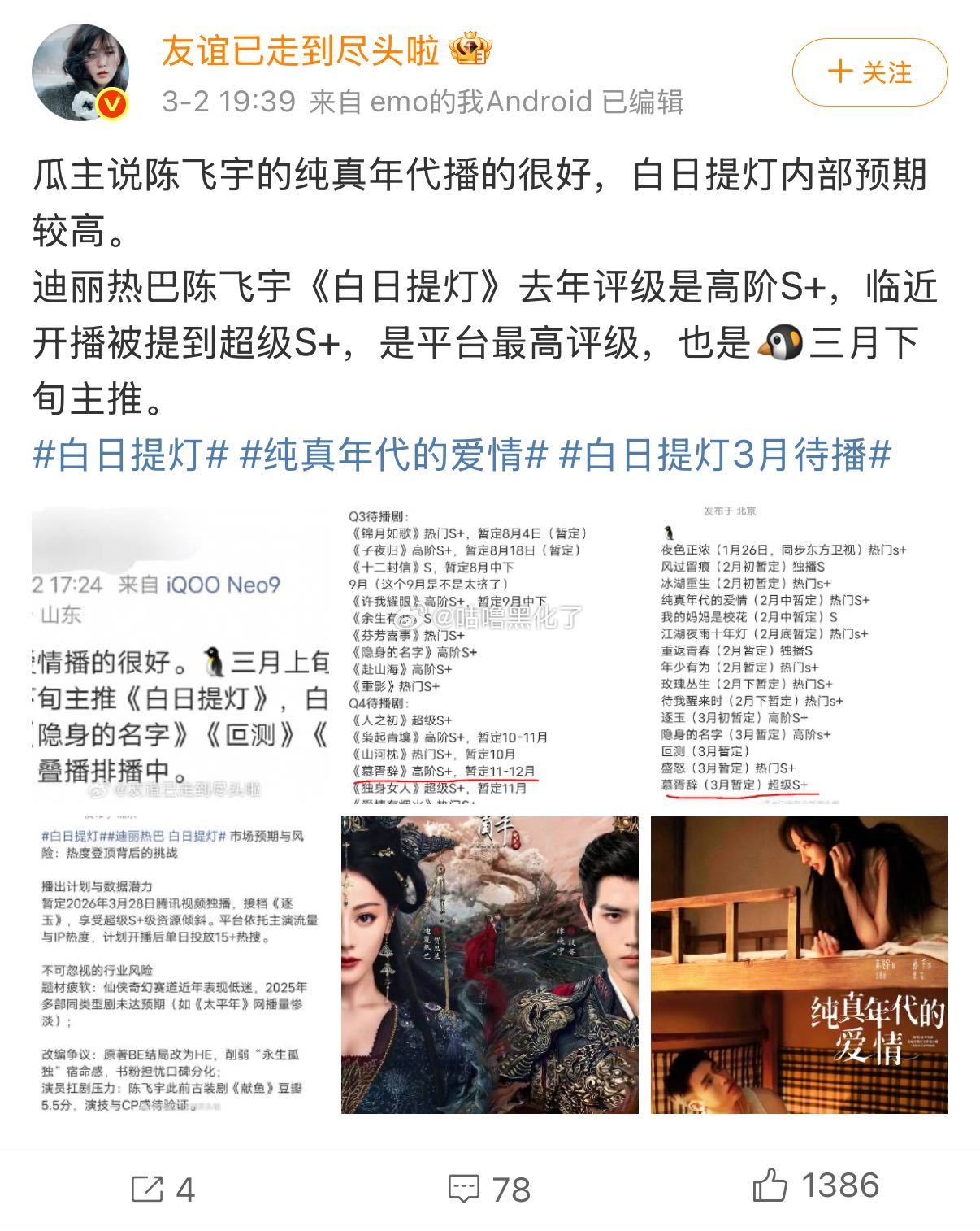 纯真年代的爱情大结局 《纯真年代的爱情》今天超点收官,播出成绩CVB破2,云合破20%,今年🐧站内热度TOP1,陈飞宇第三个破9的V榜角色GET,这波剧实绩和个人热度都收入囊中! 陈飞宇新剧央八暂年冠 陈飞宇三个角色v榜破9 方穆扬费霓一起上大学 方穆扬喂费霓吃饭 磕到了