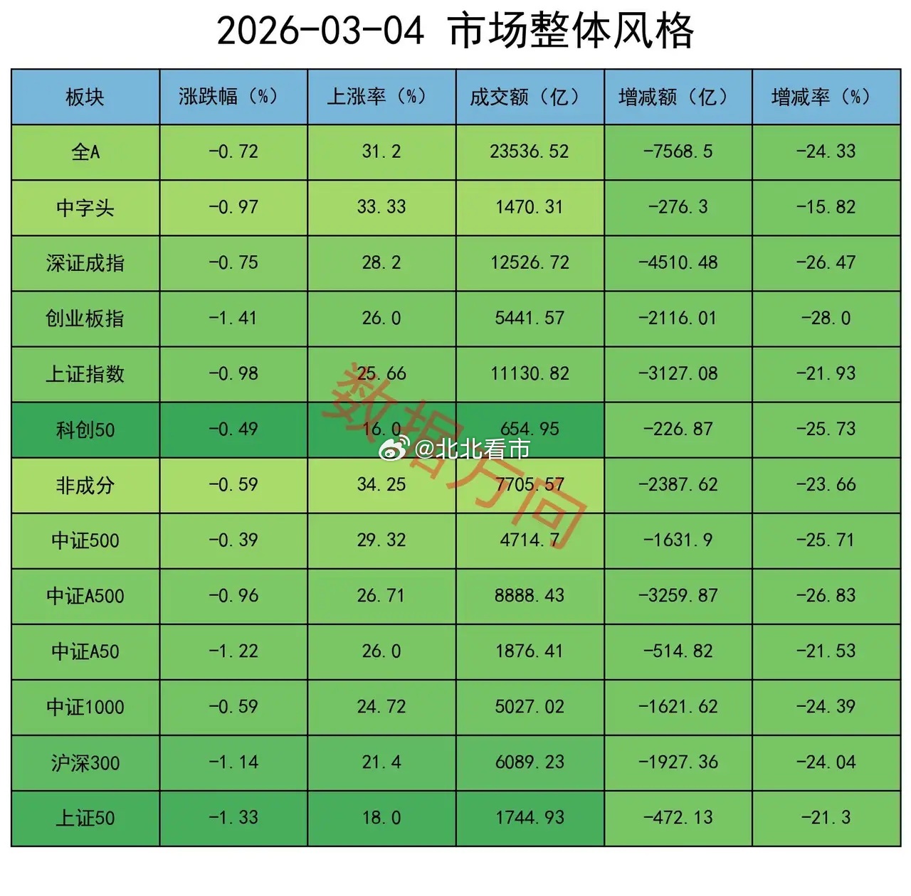 大盘低开后缩量整理,全A指数跌幅0.72%,电网设备、国防军工、农林牧渔等逆市上涨,受事件驱动的石油石人、港口航运、贵金属等跌幅居前,个股上涨率为31%,大幅缩量24%。