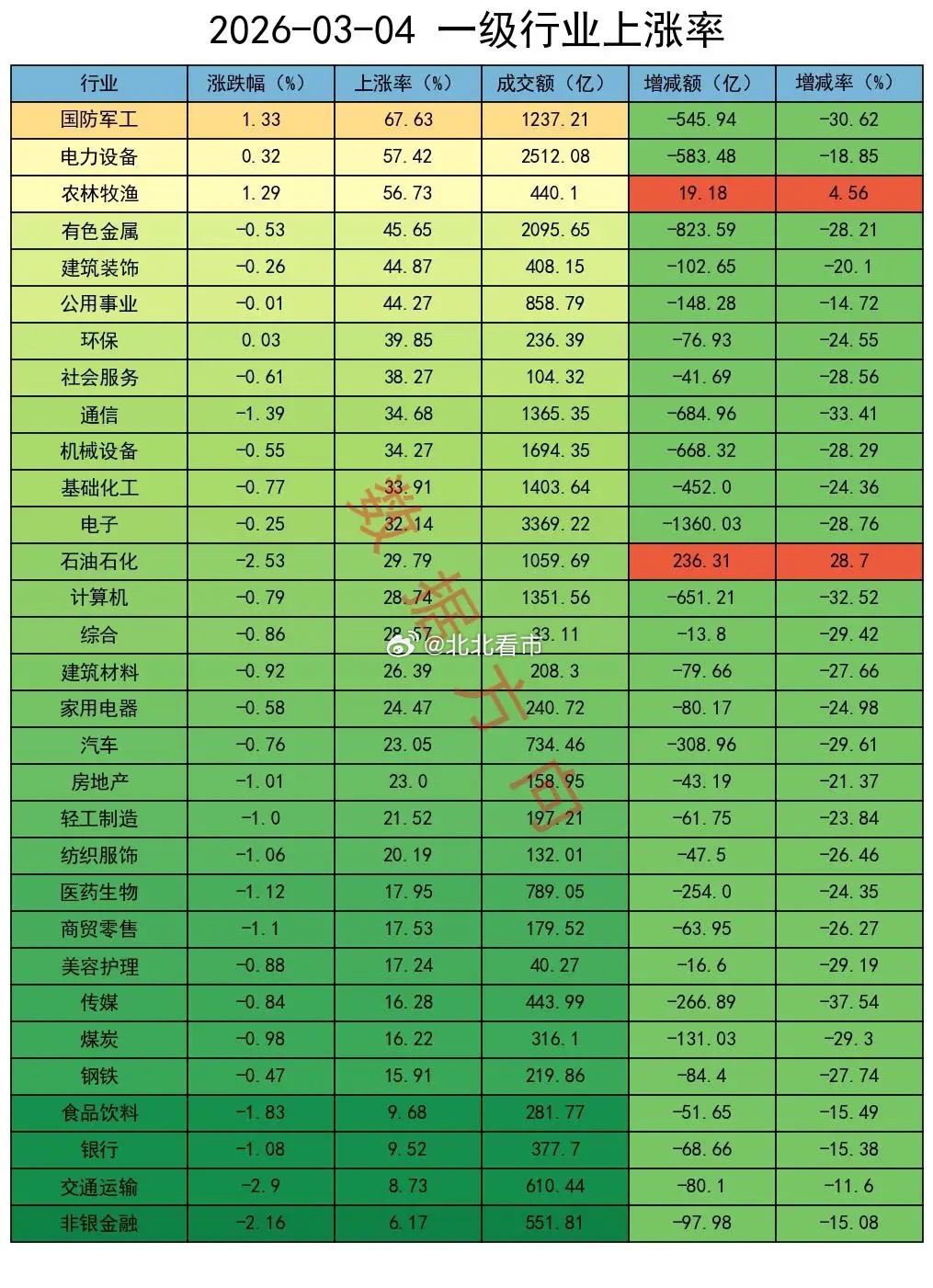 31个申万一级行业里面,仅有国防军工、电力设备、农林牧渔、环保等4个行业收涨