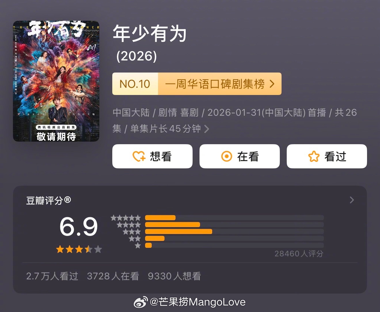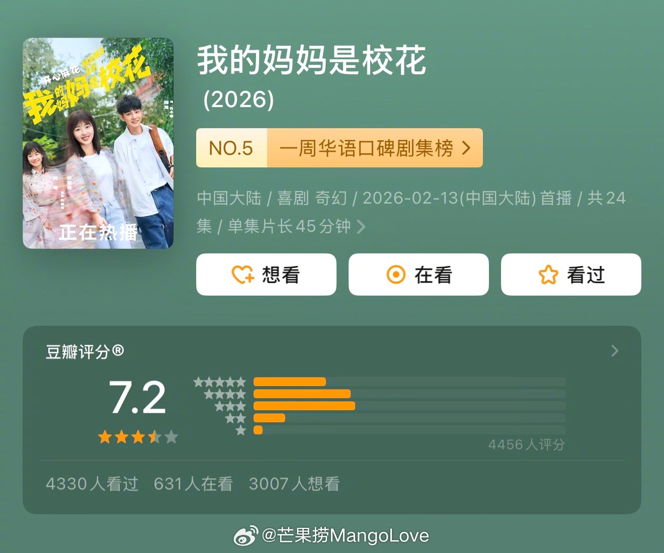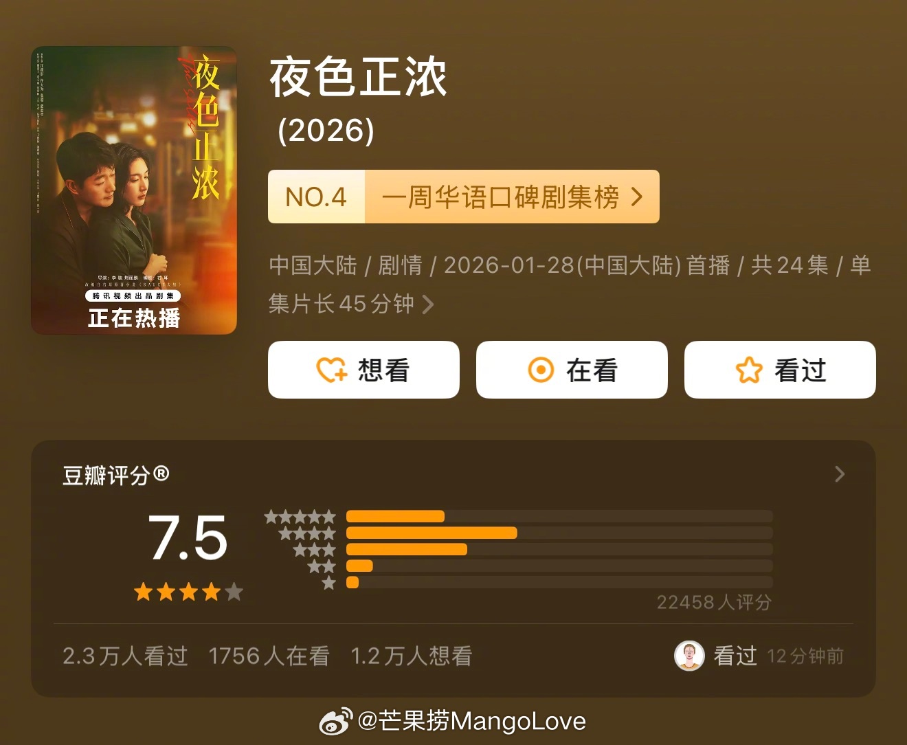 近期热播剧集豆瓣评分开分江疏影 / 佟大为 / 张超 / 蓝盈莹 / 阚清子 夜色正浓 7.5分魏大勋 / 岳云鹏 九号秘事之黑帷背后 7.3分王楚然 / 丞磊 / 唐晓天 / 胡意旋 成何体统 7.2分邓恩熙 / 蒋龙 / 刘琳 / 刘些宁 我的妈妈是校花 7.2分彭昱畅 / 林允 / 刘冠麟 年少有为 6.9分龚俊 / 姜武 / 孙怡 风过留痕 6.3分