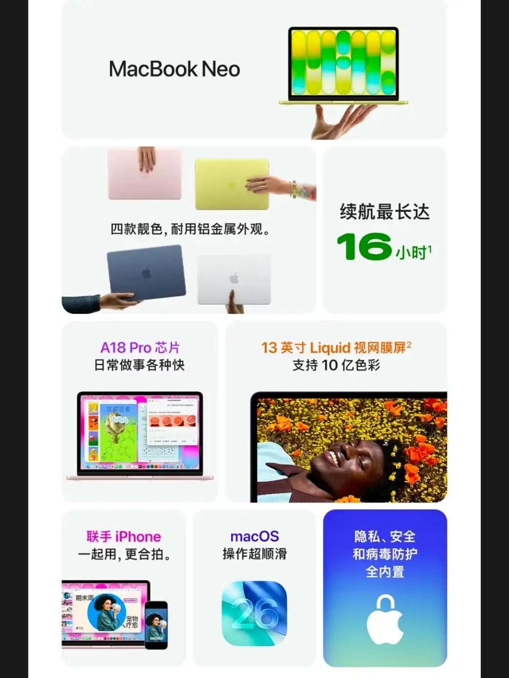 苹果的MacBook neo定位很精准,就是延续8+256模式,收割娱乐轻办公用户。过去苹果的MacBook air的入门款一直是8+256,长期被人诟病,现在把air的基础款提升到了16+512,但价格也贵了很多,显然苹果不愿意放弃低端入门用户,索性把手机处理器A18Pro迁移到MacBook平台,当成低端入门款,争夺轻薄本市场。相信那些买不起air的用户,会被neo吸引。
