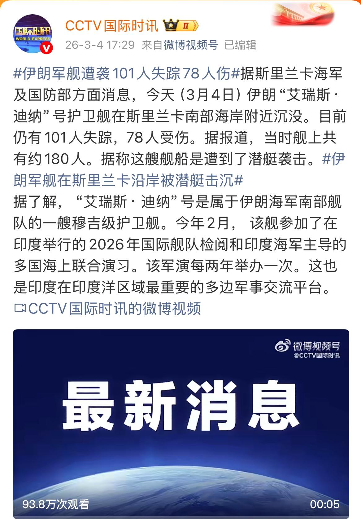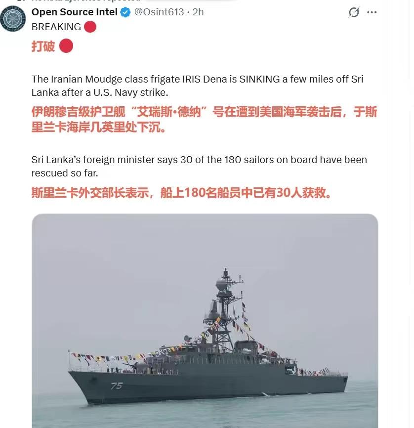 伊朗军舰疑似遭潜艇袭击,伤亡惨重! 据斯里兰卡海军及国防部消息,3月4日,伊朗“艾瑞斯·迪纳”号护卫舰在斯里兰卡南部海岸附近沉没。其遇险地点距斯里兰卡南部海滨城市加勒约40海里(约74公里)。斯海军接到求救信号后迅速派出舰艇展开救援行动,已有35人获救并被送往加勒的一家医院。斯方还派遣一架飞机前往事发海域协助搜救。据悉,当时舰上约有180人。 报道引述斯里兰卡外长维吉塔·赫拉特的话称,“德纳”号遇险水域并非斯里兰卡领海。 有说法称,这艘舰船可能遭到了潜艇袭击。 若情况属实,意味着美以早就在觊觎伊朗的这艘军舰。按照美国当前的战略部署,下一步便是让伊朗去军事化,美国宣称将摧毁伊朗的所有海军力量。因此,很可能是美国潜艇对伊朗军舰发动了袭击。这也意味着,美伊之战开始向世界其他地区蔓延。美国的挑衅行径将美伊战争外溢风险推至顶点。 如今,即便伊朗领导层几乎被赶尽杀绝,美国仍未收敛其激进之举,依旧在军事上持续施压。长此以往,美伊冲突极有可能演变为一场全球性危机,给世界和平与稳定带来巨大挑战。