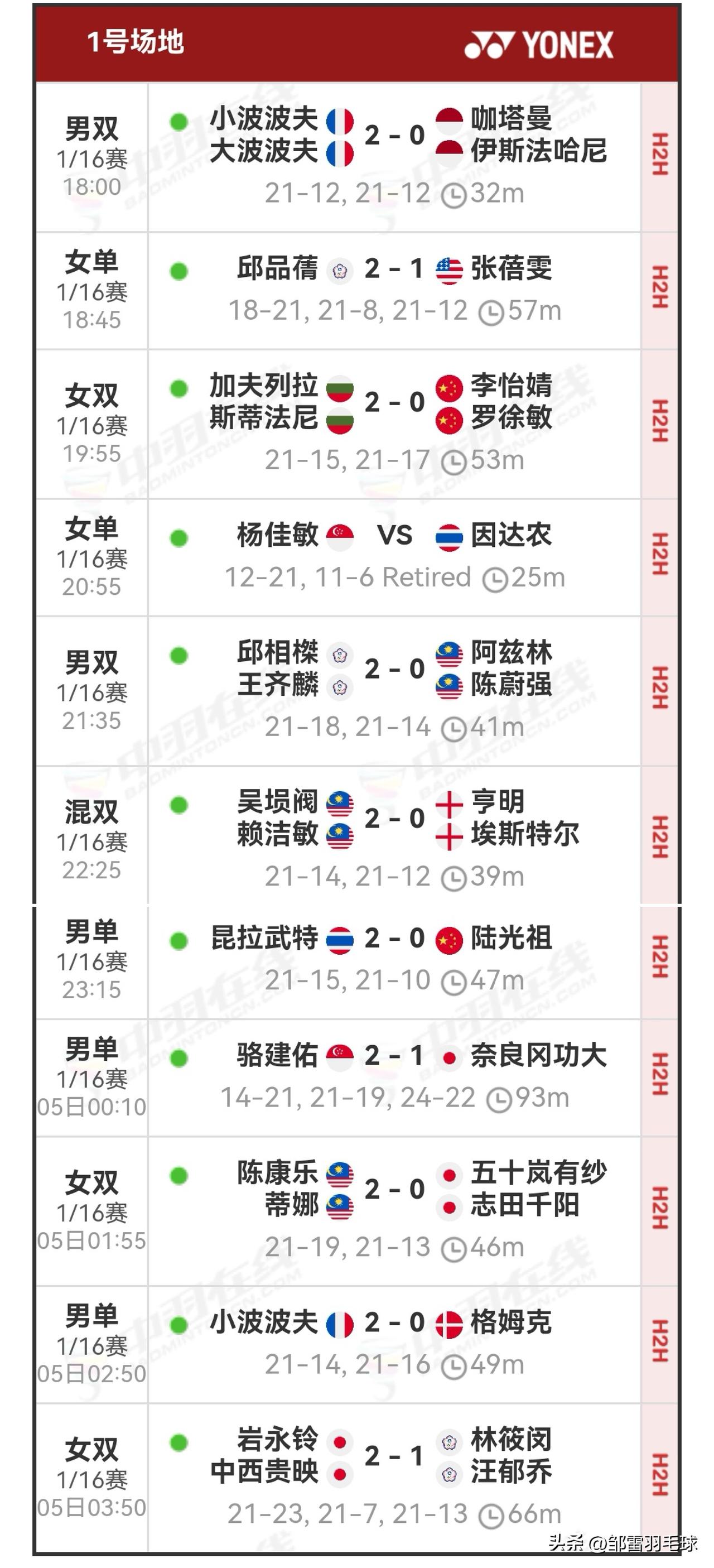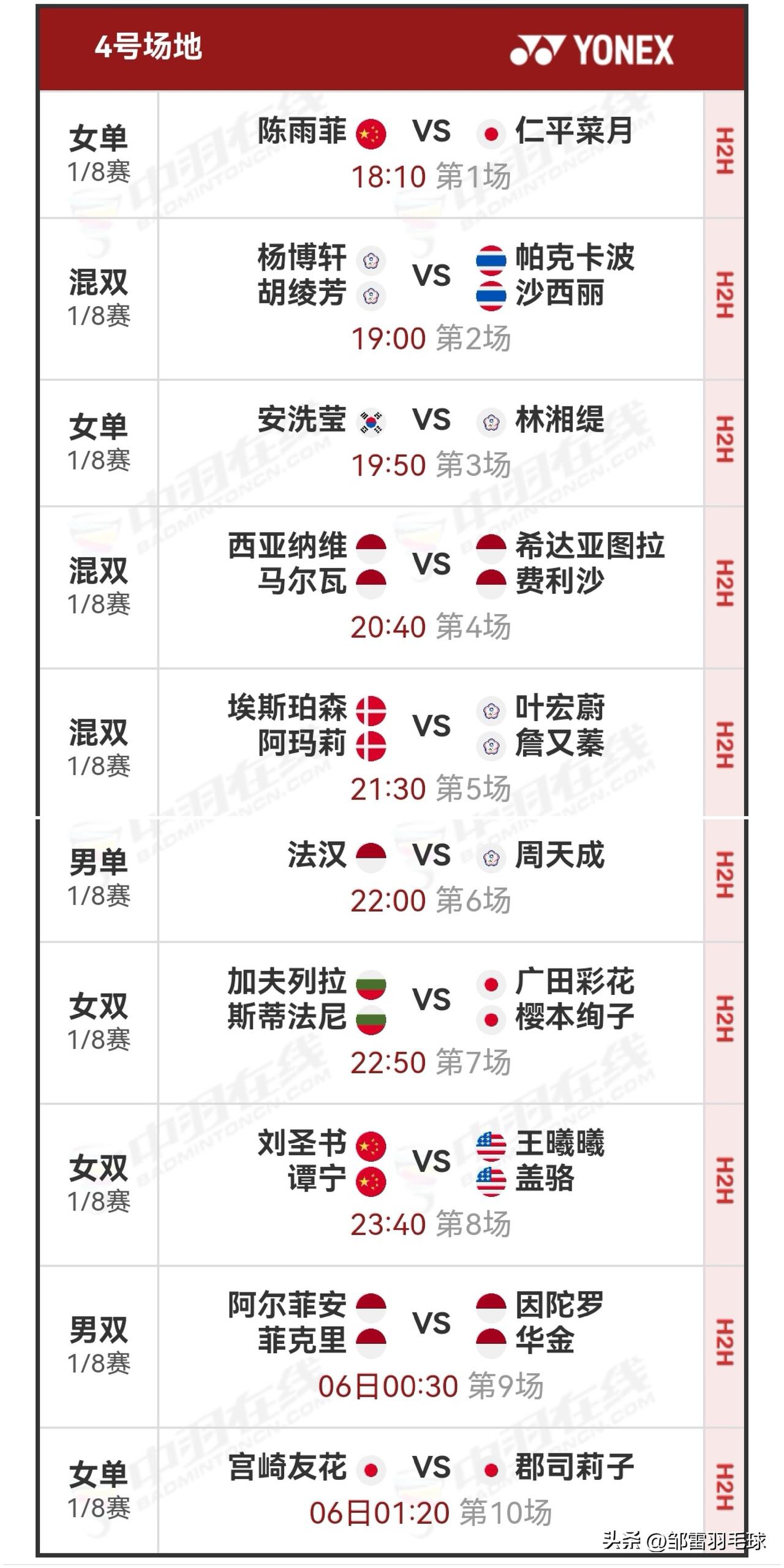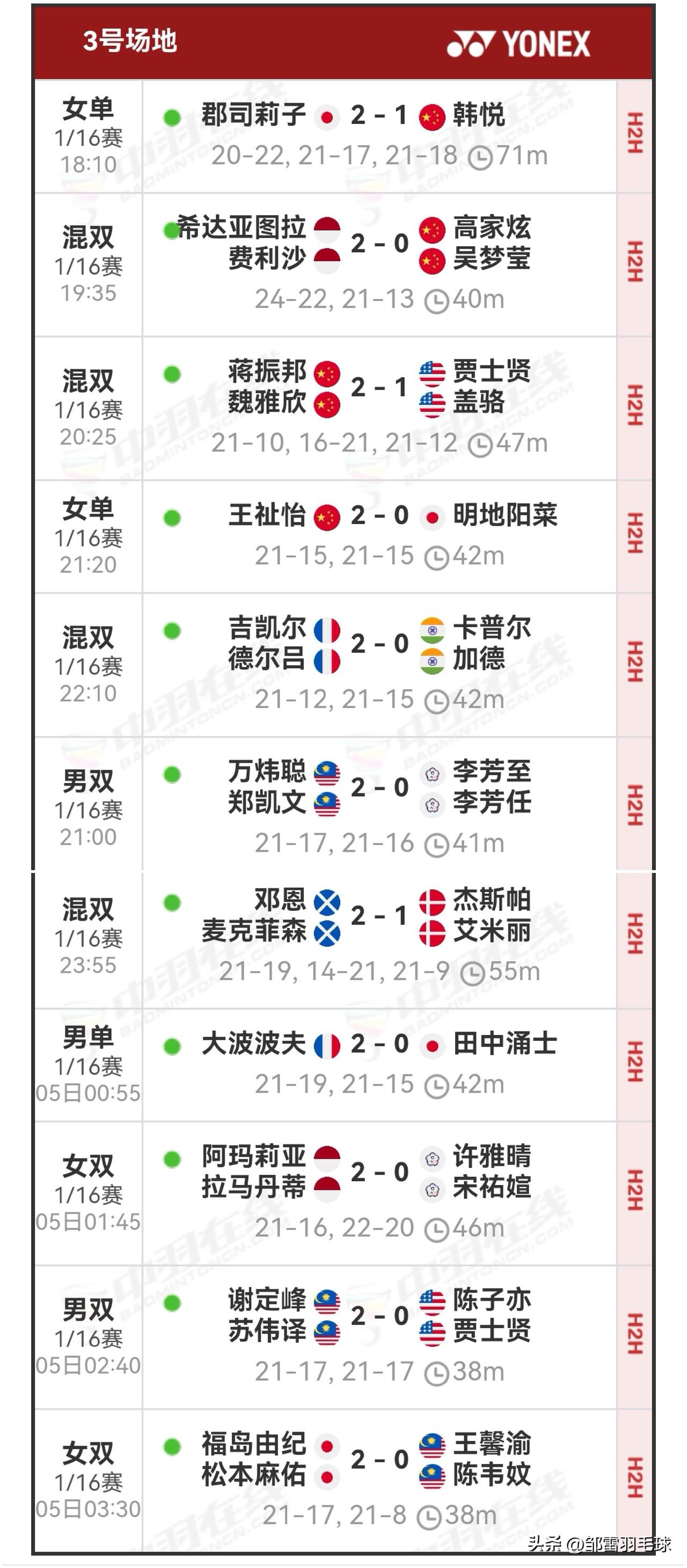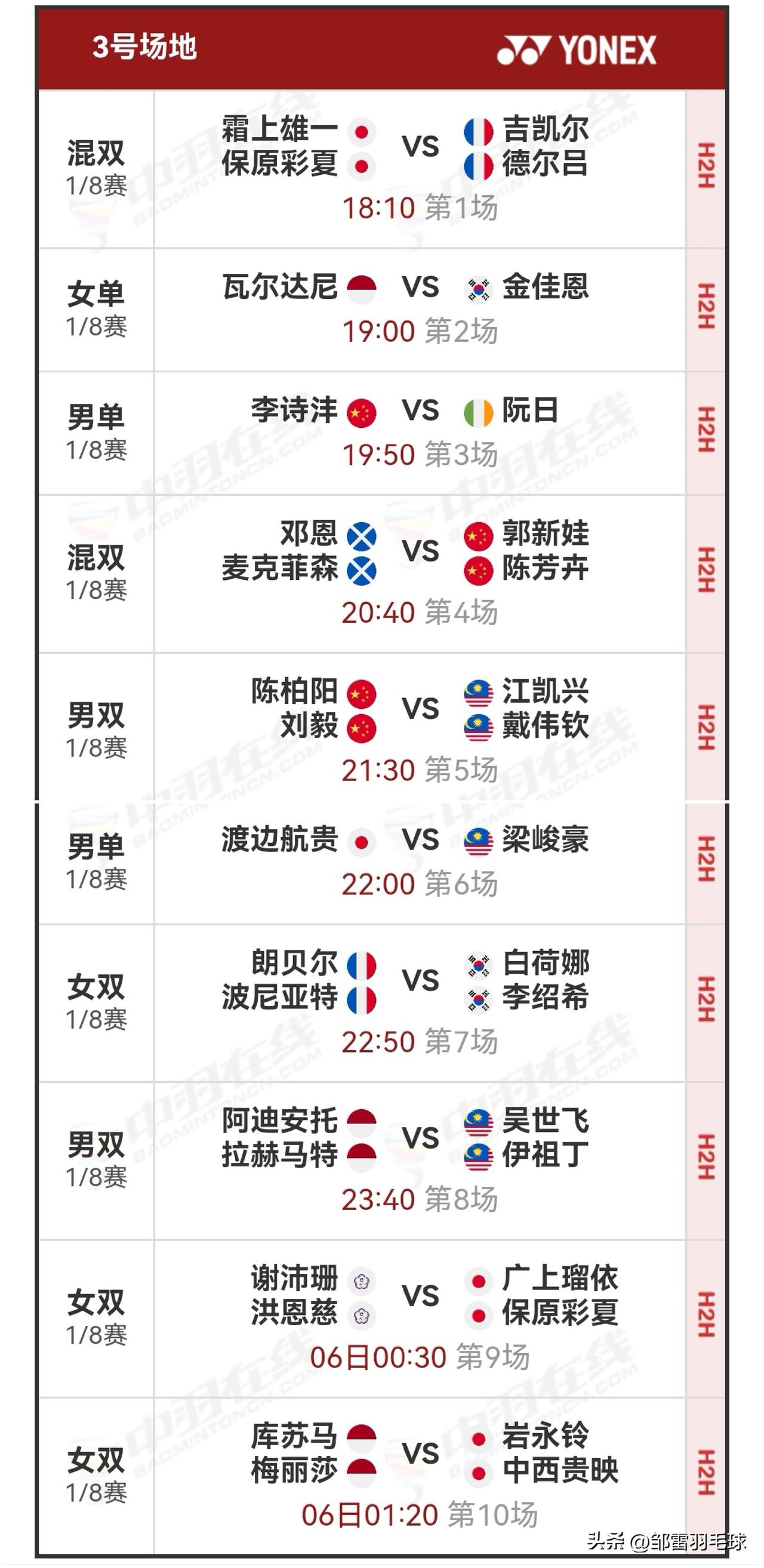 3月5日全英羽毛球公开赛1/8决赛赛程安排 国羽昨日战况不佳,4胜5负损失惨重。酱板鸭组合历经三局苦战,击败贾士贤/盖骆;王祉怡直落两局战胜明地阳菜;100分组合两局横扫省队选手何志伟/黄睿璿;郭新娃/陈芳卉在三局大战中实现逆转,淘汰林秋仙/林秋仙,他们均顺利晋级16强。 李怡婧/罗徐敏连输两局,负于加夫列拉/斯蒂法尼;陆光祖两局便被昆拉武特淘汰;星驰组合不敌麦斯/布施;韩悦激战三局后被郡司莉子逆转;高家炫/吴梦莹两局完败于印尼组合,他们均首轮出局,惨遭一轮游。 经过两天的激烈角逐,首轮1/16决赛全部打完,国羽共取得10胜9负的成绩,近乎折损半数战力。 今日北京时间18:00,将进行1/8决赛。对阵安排为李诗沣对阵阮日,陈雨菲对阵仁平菜月,王祉怡对阵安洗莹,100分组合迎战黑塔组合。今日详细对阵安排和昨日详细战报如图所示。 羽毛球 羽毛球爱好者 羽毛球比赛 你认为国羽能在全英赛取得怎样的成绩 国羽 王祉怡 安洗莹 李诗沣