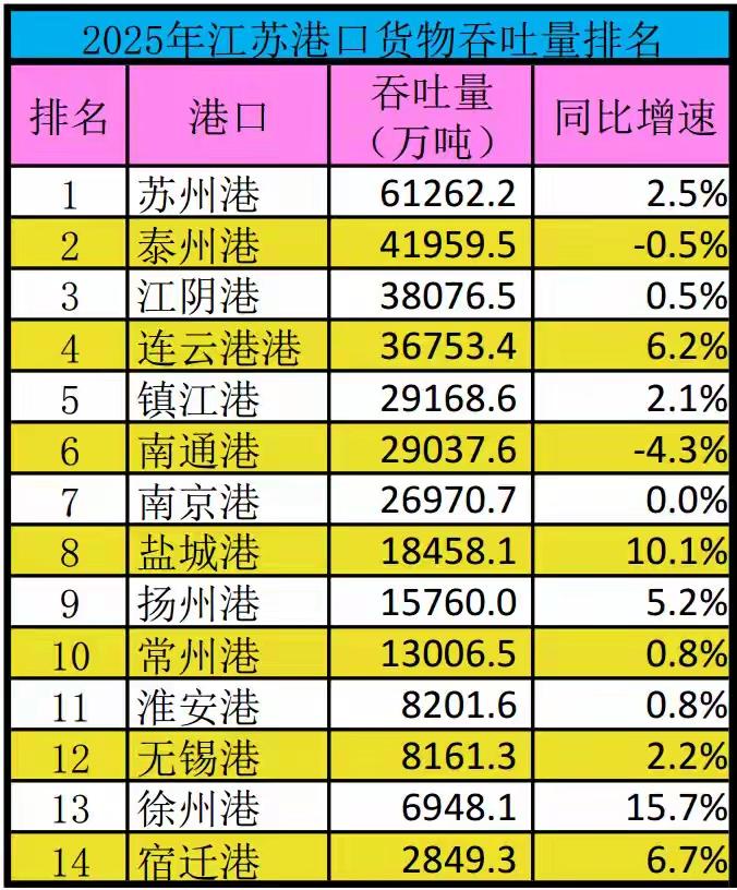 港口 江苏 徐州港货物吞吐量在全省排第13名,集装箱吞吐量排第12名,一个倒数第三,一个倒数第二,成绩不理想。在省内仅能超过宿迁港。 苏州港两项排名均为江苏第一。苏北的连云港港凭借海运优势,货物吞吐量和集装箱吞吐量分别位列全省第2和第4。盐城港超过淮安港不在话下。可笑的是,无锡港的货物吞吐量和集装箱吞吐量都比不上江阴港。 连云港 盐城 淮安 宿迁 江阴 无锡