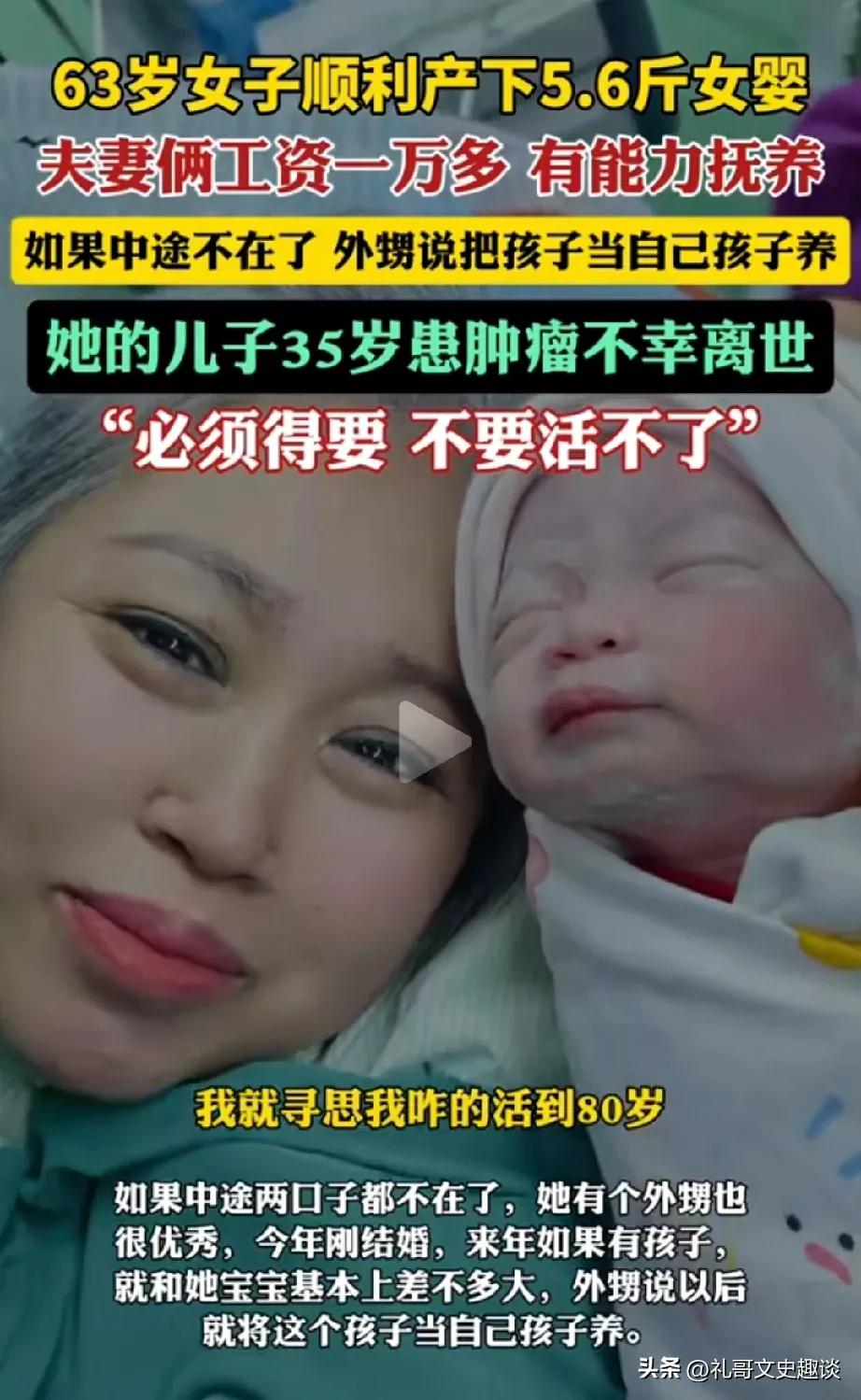 奇迹,63岁女子铲子。女子今年63了,顺利产下一健康宝宝,她说必须要生这个孩子,不生这个孩子她就活不了。因为她大儿子在35岁的时候得了不治之症,离开他们了。他们夫妻两个成了失独家庭,一下子天塌了。 他们之所以计划再生是因为他们有能力抚养,他们俩退休金1万多,她母亲都是90多才去世,她怎么的也得活到80岁,那时候孩子长大了,所以他们感觉没什么问题。 很多网友说这样是对孩子不公平的,为了自己晚年精神有寄托,要了孩子,老年人没有精力照顾孩子,到时候自己都顾不住该怎么抚养孩子。