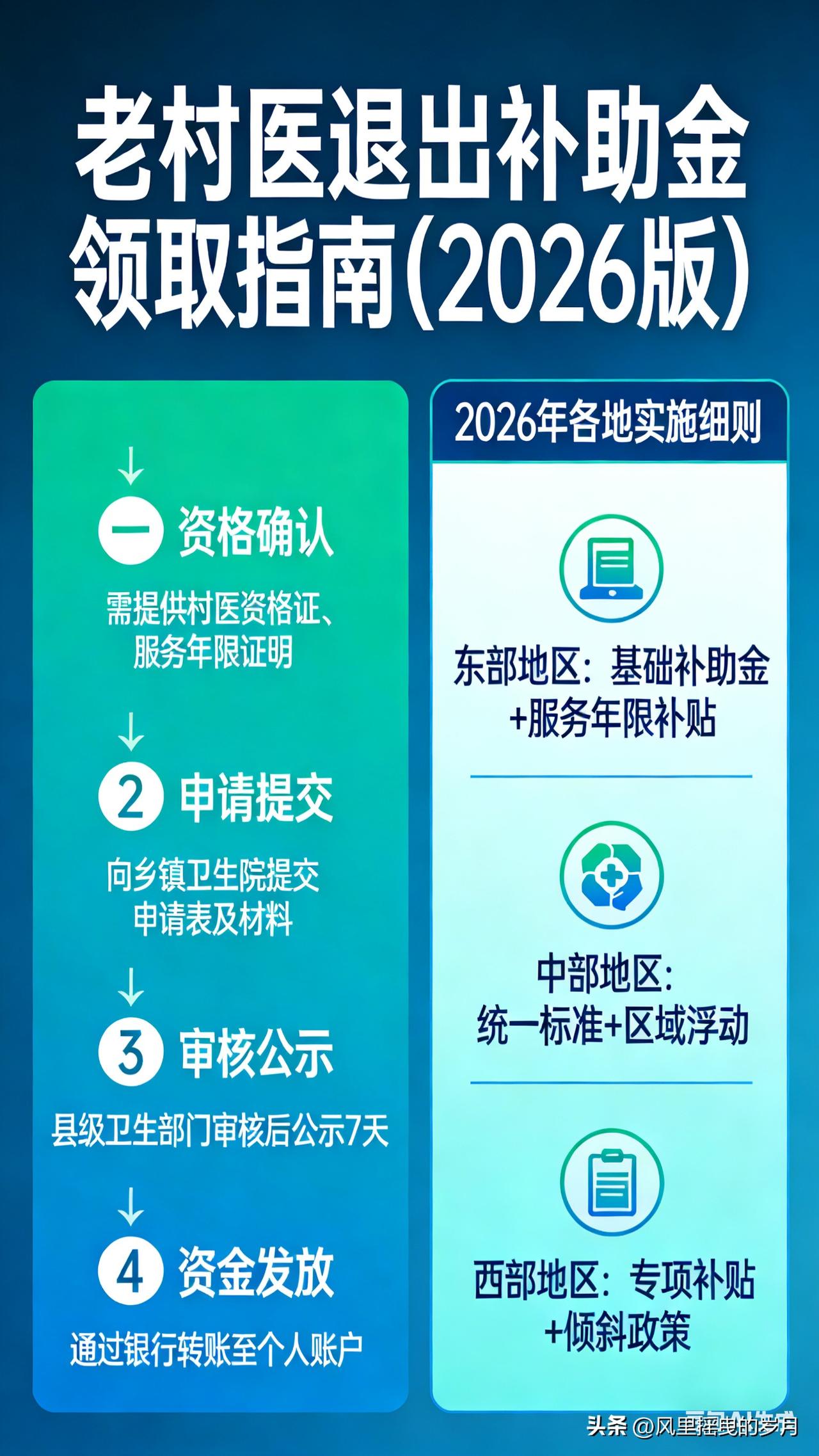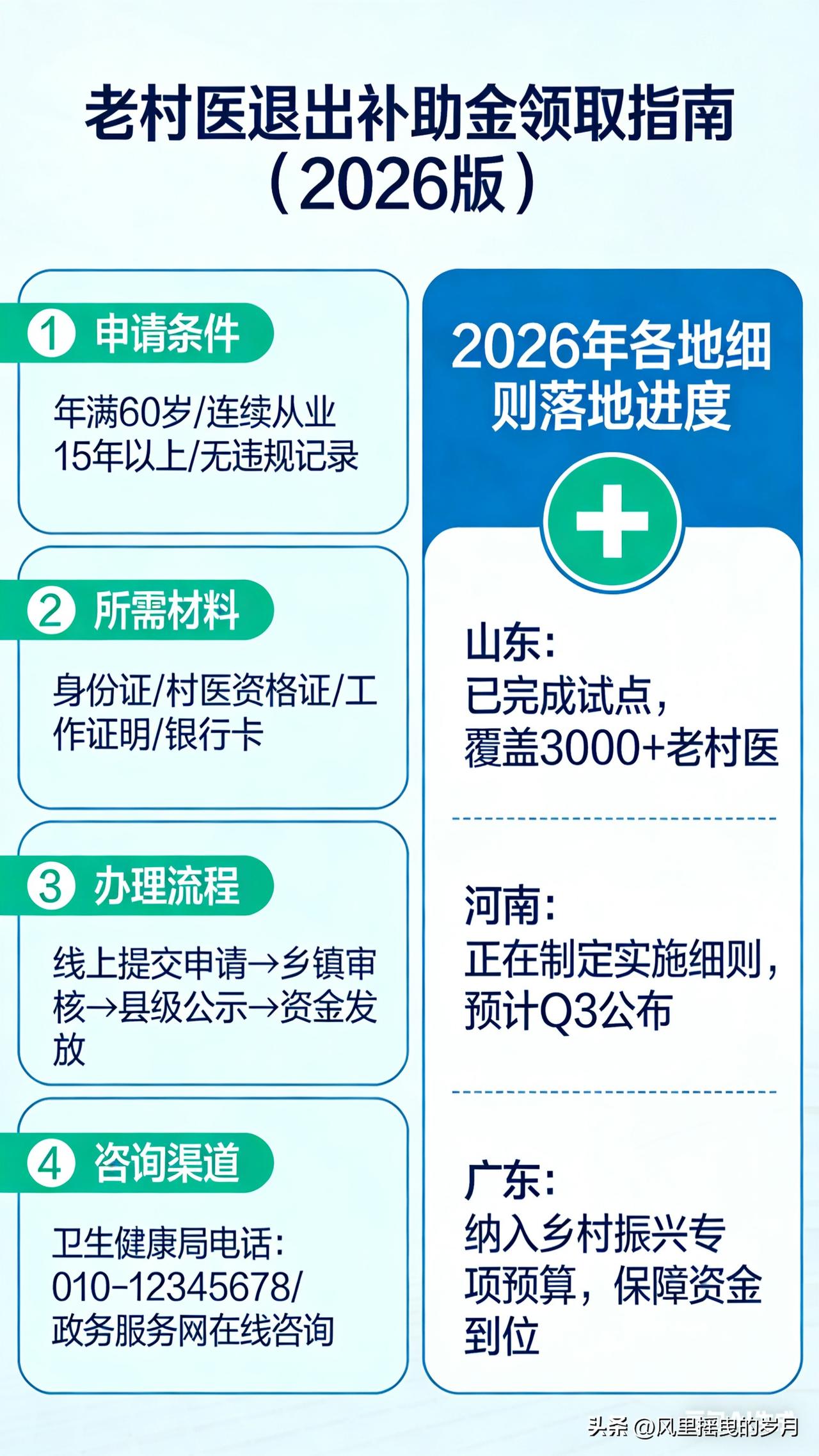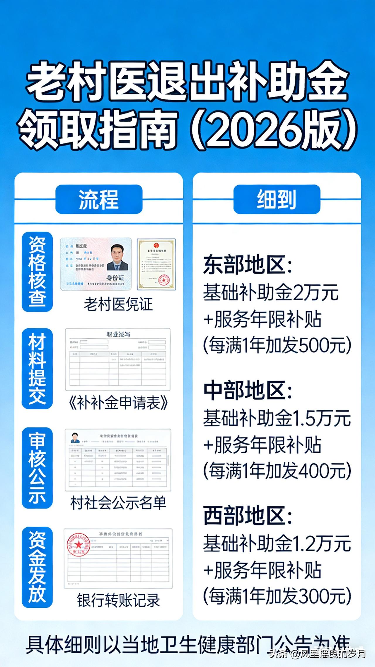 老村医退出补助金怎么领?2026各地细则落地 乡村白大褂 2026年3月4日 17:55 江苏 2026年,老村医退出生活补助政策全面落地,各省、市、县细则相继出台,申领条件、补助标准、办理流程进一步明确。为方便广大老村医顺利申领,本文整理全国通用政策及各地核心细则,手把手教你办理。 一、谁能领?4项核心资格(全国统一) 符合以下全部条件,即可申请老村医退出补助金: 1. 年龄达标:男性年满60周岁,女性年满55周岁,正常到龄退出岗位; 2. 工龄合格:在村卫生室连续执业累计满3年及以上,多数地区要求满10年; 3. 资质合法:持有乡村医生证、赤脚医生证、执业证等官方认可证件; 4. 无重复保障:未享受城镇职工养老保险、机关事业单位养老待遇。 二、2026各地补助标准一览 各地结合经济水平制定标准,主要分为工龄补助制和定额补助制,偏远地区另有倾斜。 - 山东:每工龄年20元/月,30年工龄每月600元,老区额外补贴30元; - 吉林:满10年工龄定额300元/月,省级财政承担50%; - 甘肃:基础养老金+工龄补助(8元/年/月),财政分级承担; - 河南:10年以上工龄每月不低于300元; - 安徽:30年以上工龄每月不低于528元,按工龄阶梯发放 。 三、申领流程:4步办结,全程免费 按照国家卫健委统一指南,办理流程简化,最快1个月完成,不收取任何费用。 1. 准备材料 身份证、户口本、社保卡;执业资质证明;村委会+卫生院盖章的工龄证明、离岗证明;工龄认定表(村民代表签字);未享受职工保承诺书(按需提供)。 2. 提交申请 向户籍所在地乡镇卫生院提交材料,填写《退出村医生活补助申请表》。 3. 审核公示 乡镇审核后公示7个工作日,无异议后报县级卫健、财政部门审批。 4. 发放到位 审批通过后,补助按月打入社保卡(一卡通)账户,定期发放。 四、常见问题解答 1. 证件丢失怎么办? 可凭工作档案、门诊记录、村民及老同事签字证明,经乡镇核实后认定工龄。 2. 中断执业能否累计工龄? 多数地区允许合并计算累计执业年限。 3. 补助何时开始发? 到龄退出次月起发放,身故后次月停发 。 五、重要提醒 1. 申领全程免费,切勿相信中介代办; 2. 未申领的老村医尽快向乡镇卫生院咨询办理; 3. 各地细则略有差异,具体以本县卫健部门通知为准。 本文来源:白大褂在线 作者:乡村老郎中 专注基层医卫政策,守护村医合法权益,更多资讯持续更新。