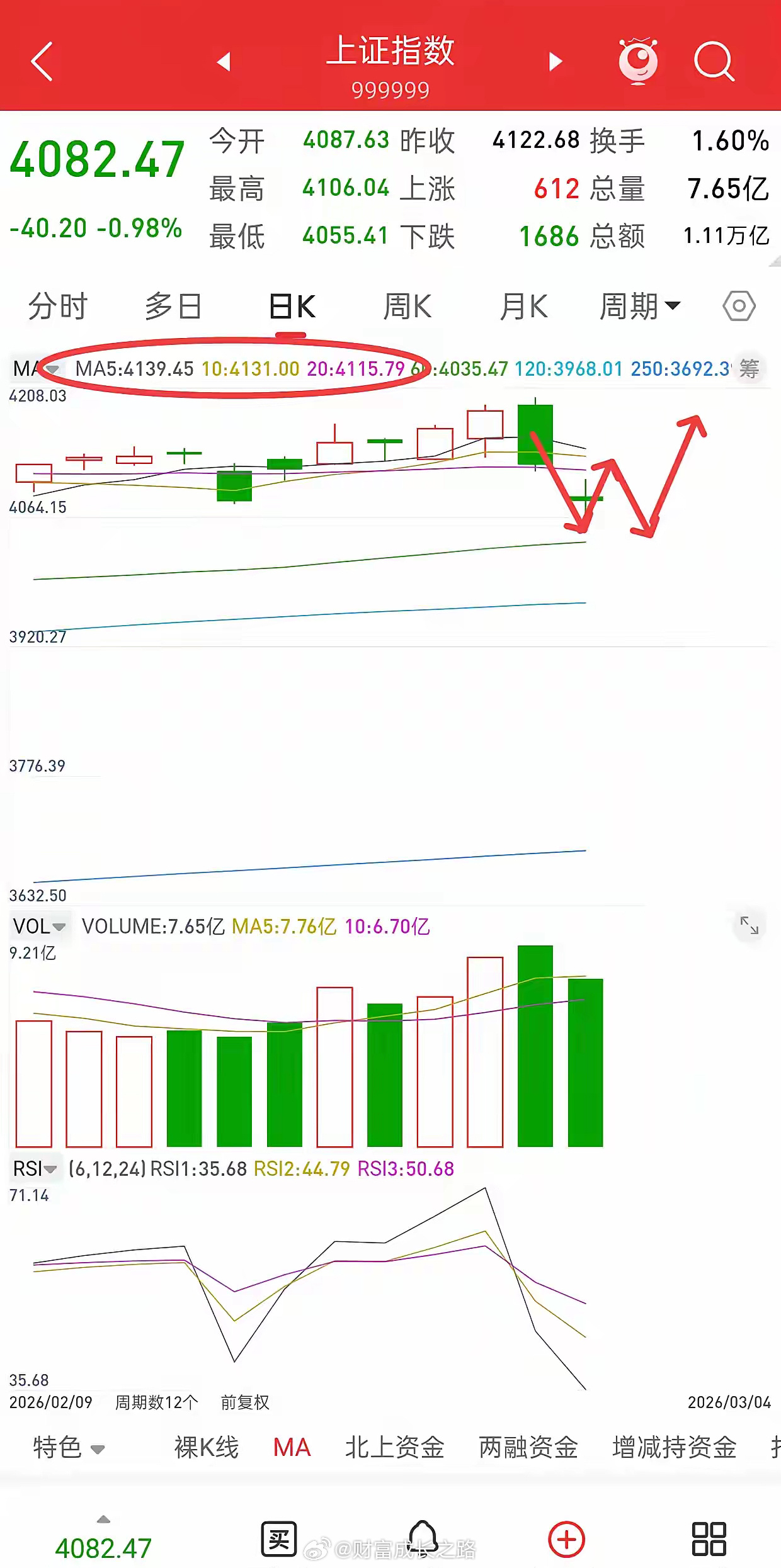 先说观点,今天如果反弹,目标只看到4110—4130左右,这里是10-20日均线压力,到压力位附近,继续看二次探底,下方第一支撑4050左右,第二支撑4010左右。