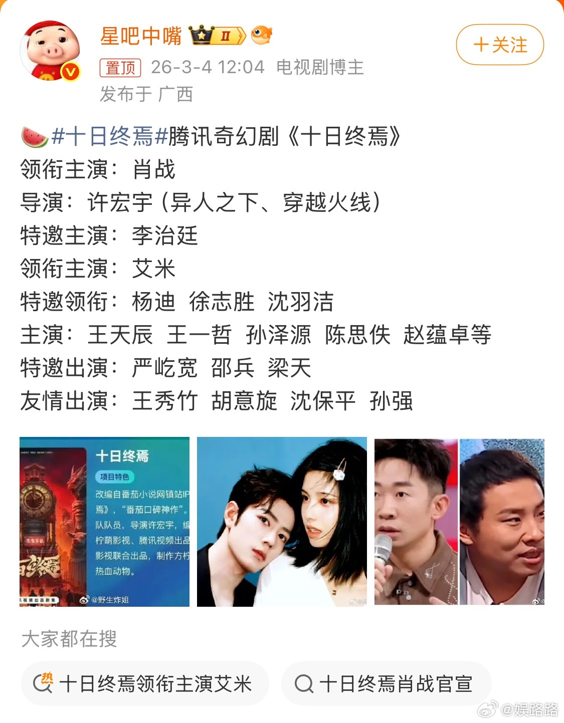 刚刷到《十日终焉》的阵容名单,女主角是艾米,说实话第一反应是有点意外😮毕竟是这么大的IP,还是肖战主演的剧,一开始会觉得这个演员阵容和顶流IP、顶流演员的搭配,是不是有点“不够顶”?