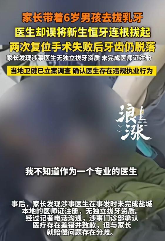 医德何在?江苏盐城,母亲带6岁儿子去口腔医院拔乳牙,不知道是粗心大意还是理解有误,医生竟然把孩子新长出的两颗恒牙连根拔起,确诊拔错牙后,医生先后两次给孩子进行复位手术,结果两次手术都失败,导致错过了最佳治疗时机,这两颗恒牙也很可能无法保住,事后,母亲才得知,该医生并不具备拔牙资质,医生有错不用说,但孩子的恒牙到底该怎么办? 事情的经过其实不复杂,孩子妈妈带着6岁的儿子去当地一家口腔门诊部,就因为孩子的乳牙没按时脱落,影响了新牙生长,想着找医生拔了省事,谁能想到这一去,竟给孩子留下了一辈子的遗憾。 当时接诊的医生,不知道是太粗心,还是根本没分清乳牙和恒牙,上手就把孩子刚萌出来的两颗恒牙给拔了,本该拔的乳牙却纹丝不动。 孩子妈妈一开始也没发现异常,回家后才察觉到不对劲,赶紧带孩子回门诊检查,经过CT确诊,确实是拔错牙了。 医生当时也慌了,先后给孩子做了两次复位手术,想把拔错的恒牙重新植回去,可偏偏两次手术都失败了,就这么错过了恒牙复位的最佳时机,现在这两颗恒牙能不能保住,还是个未知数,大概率是再也长不回来了。 更让孩子妈妈崩溃的是,事后她才知道,给孩子拔牙的这位医生,根本不具备独立拔牙的资质。 说白了,这位医生虽然有医师资格证,但没在盐城本地完成执业注册,按照规定,根本不能独立给患者做拔牙操作,属于违规执业。 而这家口腔门诊明明知道他资质不全,还敢安排他接诊,这不是拿患者的健康当儿戏吗? 现在门诊方面倒是承认了医疗差错,也给孩子家长道了歉,但一提到赔偿的事,就迟迟谈不拢,不愿意按照家长的要求承担责任。 目前当地的卫健部门已经立案调查,确认了医生违规执业的事实,也在帮忙组织双方调解,可不管最后赔偿多少,孩子的恒牙已经受损,这种伤害是不可逆的。 可能有人会说,会不会是医生一时疏忽?但拔乳牙和恒牙,哪怕是刚入行的医生,也能分得清,这根本不是疏忽能解释的,说到底还是责任心不够,甚至可以说是漠视患者的健康。 孩子才6岁,恒牙一生就只有一副,被误拔之后,不仅要承受身体上的痛苦,以后还要面临牙齿修复、美观等一系列问题,甚至可能影响心理健康。 这件事也给所有家长提了个醒,带孩子看病,尤其是做这种小手术,一定要多留个心眼,先确认医生有没有相应的资质,别随便找一家门诊就应付了事。 医疗行业容不得半点马虎,医生的一句疏忽,可能就是患者一辈子的遗憾,希望这次的事能给所有医疗机构和医生敲个警钟,守住医德底线,别再让这样的悲剧发生了。
