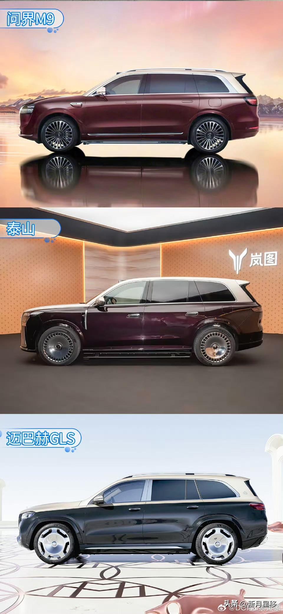 几款主流中大型SUV小PK,当然这个领域之前的盟主就是奔驰迈巴赫GLS,其他的则是挑战者! 从外观上看,首先该领域的特色,双拼颜色车身,也叫悬浮车顶,大家都不约而同的用上,不过悬浮顶颜色基本采用白色,M9和岚图泰山设定比例最优。大饼轮华境s不错! 车身姿态个人感觉最优的是泰山,稳重且有前冲的犀利感。 车身侧面看,个人感觉岚图泰山最佳。