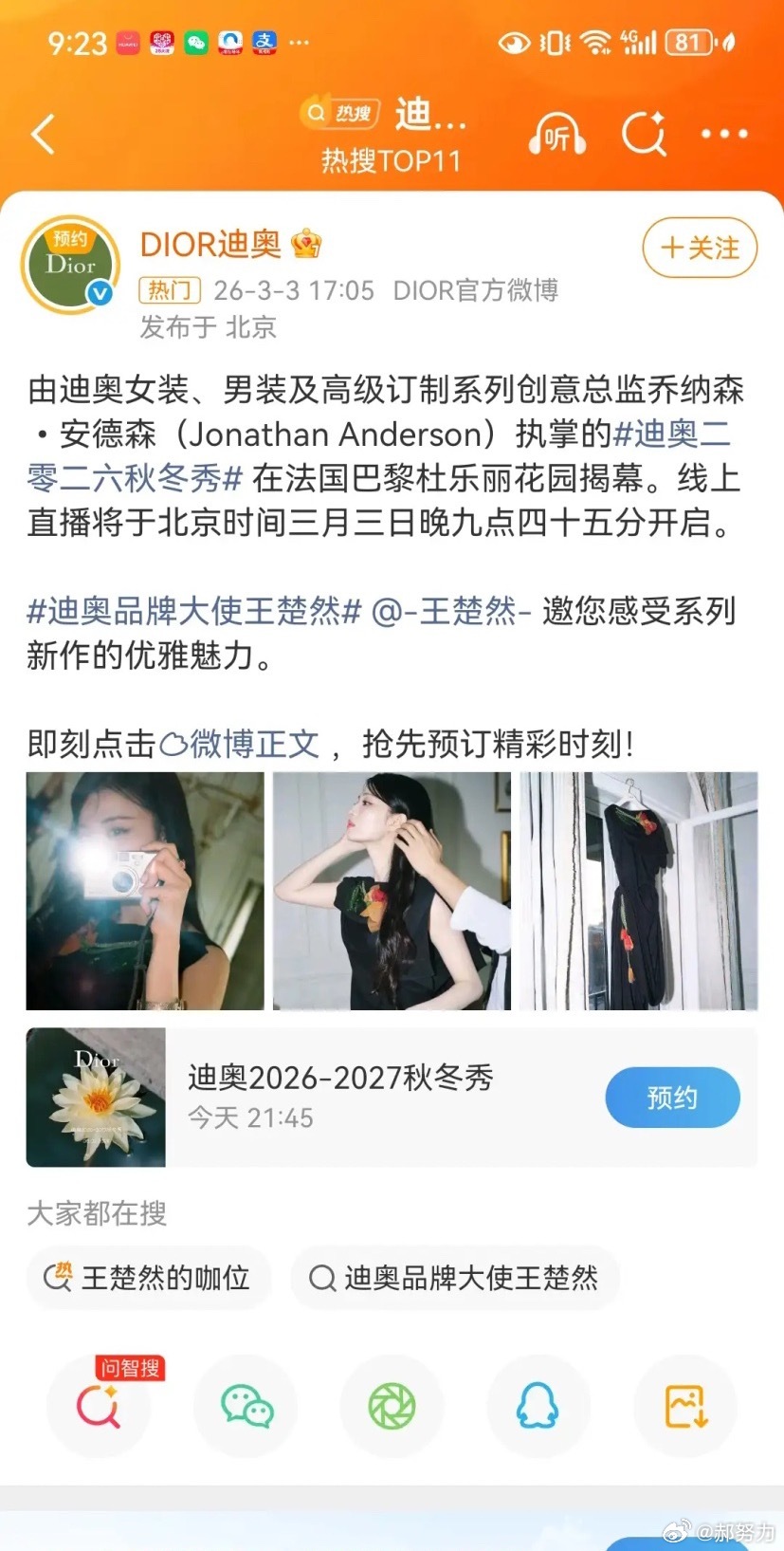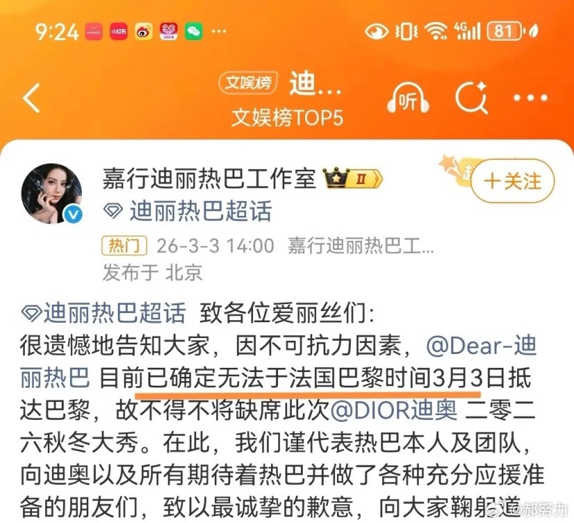 此次迪奥时装周只邀请了三位中国区品牌代言人,迪丽热巴、李昀锐和王楚然,热巴因为团队问题没能及时赶到,无法出席时装周活动。