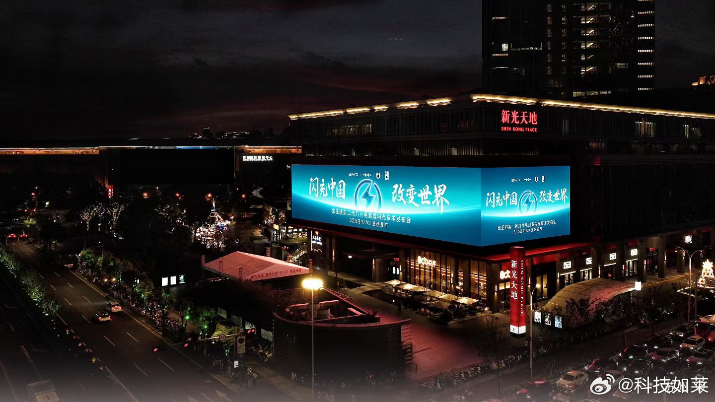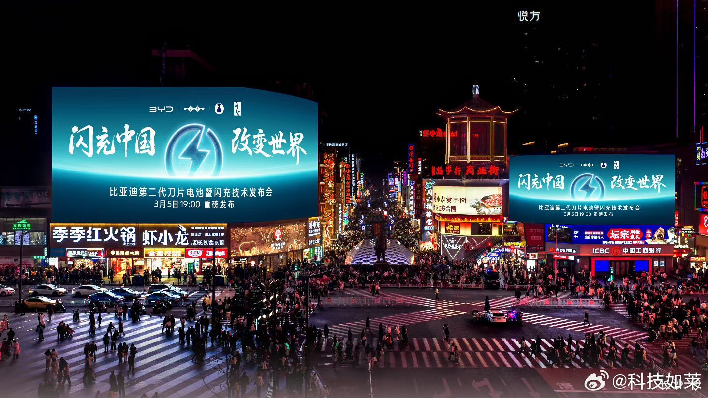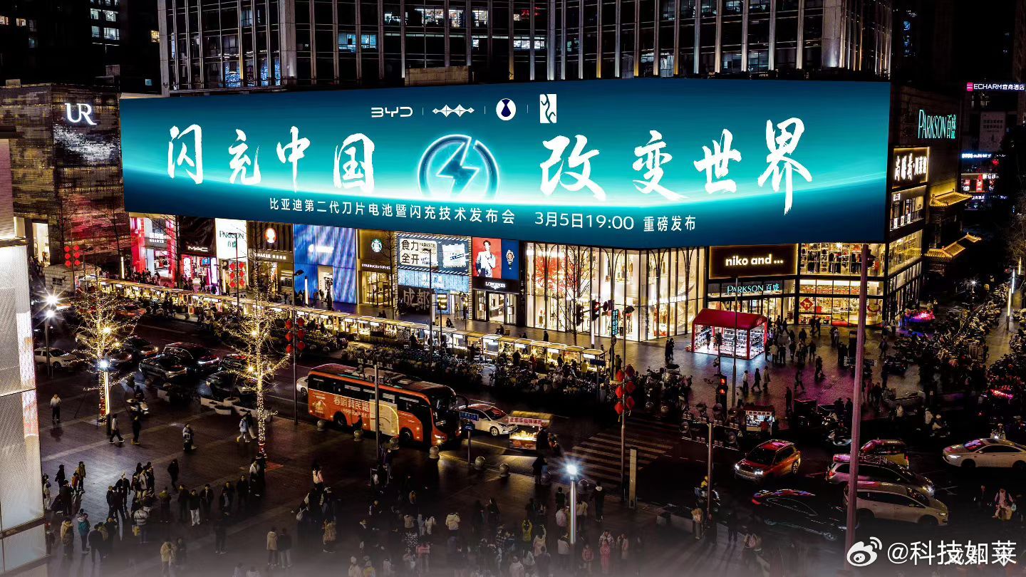 闪充中国,改变世界,比亚迪第二代刀片电池及闪充技术,点亮全国多城CBD地标大屏,这场面比亚迪确实懂排面 比亚迪今晚发布二代刀片及闪充