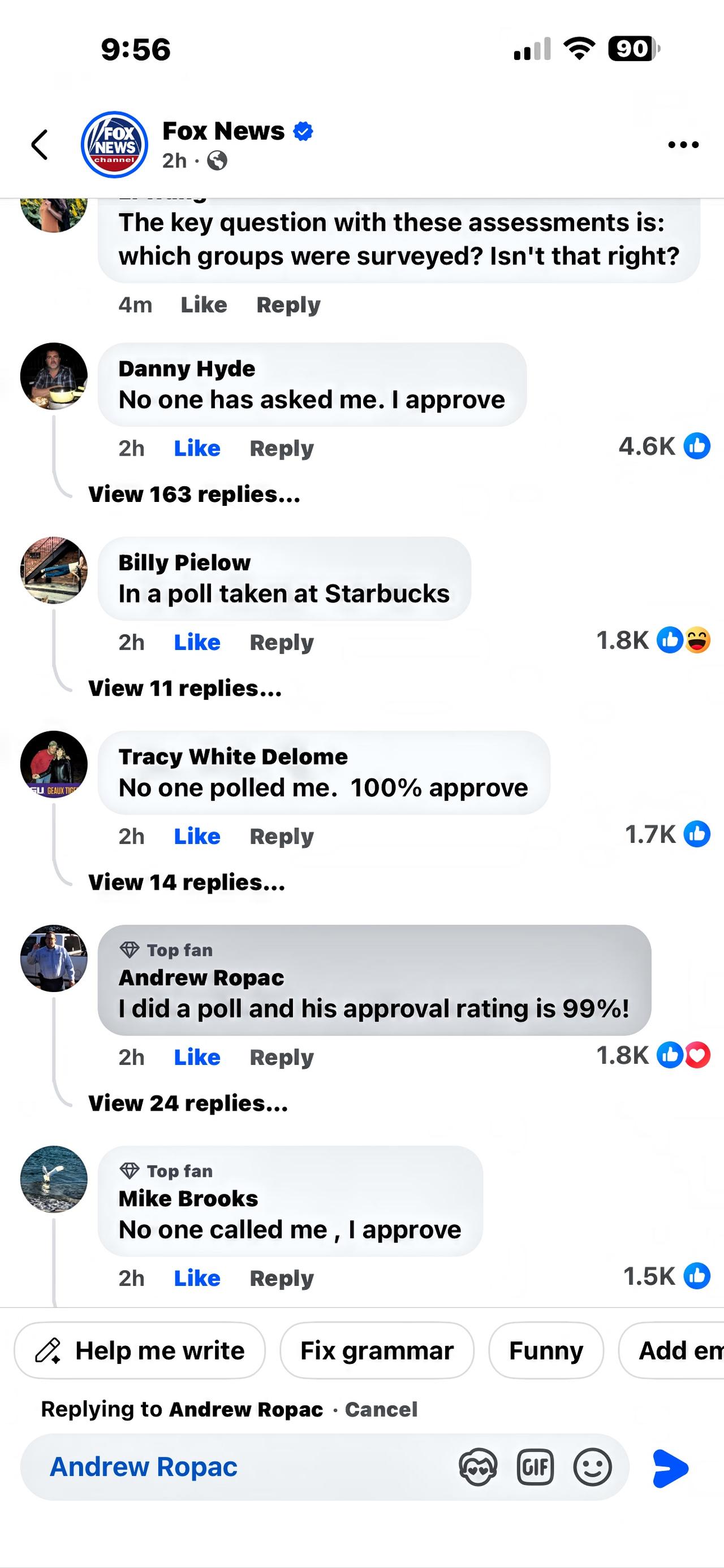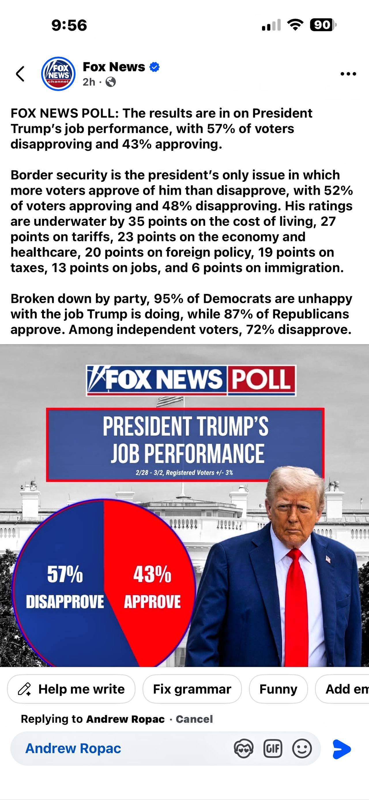 你信这些民调吗?上届总统竞选民调就是个大笑话! 福克斯新闻民调:特朗普总统的执政表现调查结果出炉,57%的选民表示不满意,43%表示满意。 边境安全是总统唯一一个支持率高于反对率的议题,支持率为52%,反对率为48%。他在生活成本、关税、经济和医疗保健、外交政策、税收、就业和移民等方面的支持率均低于预期,分别下降了35个百分点、27个百分点、23个百分点、20个百分点、19个百分点、13个百分点和6个百分点。 按党派划分,95%的民主党人对特朗普的执政表现不满意,而87%的共和党人表示满意。在独立选民中,72%的人表示不满意。 看看网友们的点评: “没人问过我的意见。100%赞同” “我做了一项民意调查,他的支持率高达 99%!” “在星巴克进行的一项民意调查😄” “没人给我打电话,我同意” “正确的事情不一定受欢迎,受欢迎的事情也不一定是正确的。” “虽然没人问过我,但我同意!” 我没有看大家的点评之前也发表了自己的的观点。“这些评估的关键问题是:调查对象是哪些群体?对吧?” 你也说说?