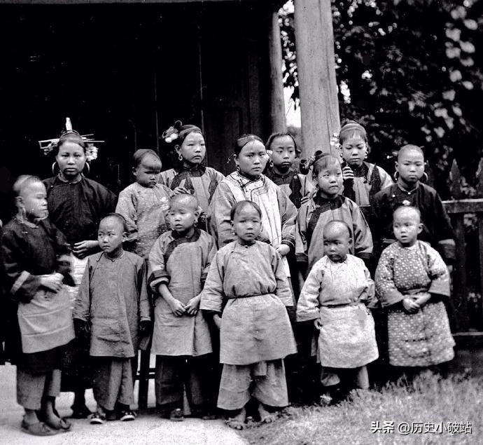 这张照片,由苏格兰摄影师约翰·汤姆逊于1868-1872年在福建福州拍摄,一群年龄各异的女童在一处廊下合影。 最引人注目的是左侧女子,她头戴福州特有的“三条簪”,这是一种由三把剑形银簪组成的独特头饰,其他女童有的穿着打补丁的粗布短衫,有的则穿着相对整洁的长衫,大部分女童都是天足,这是因为当时福州沿海地区劳动妇女普遍不缠足。女童们的表情各异,有的好奇地望向镜头,有的略显拘谨。