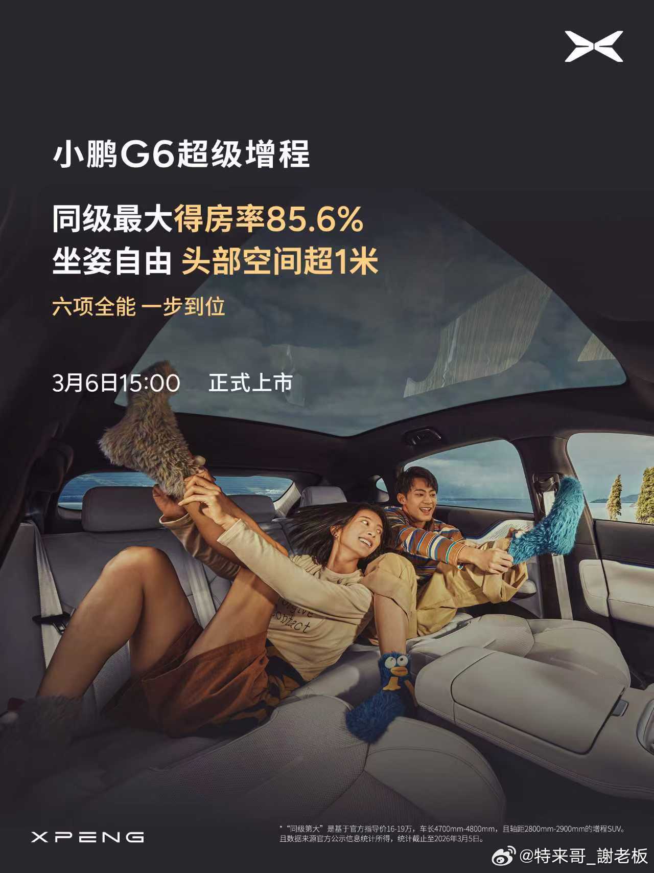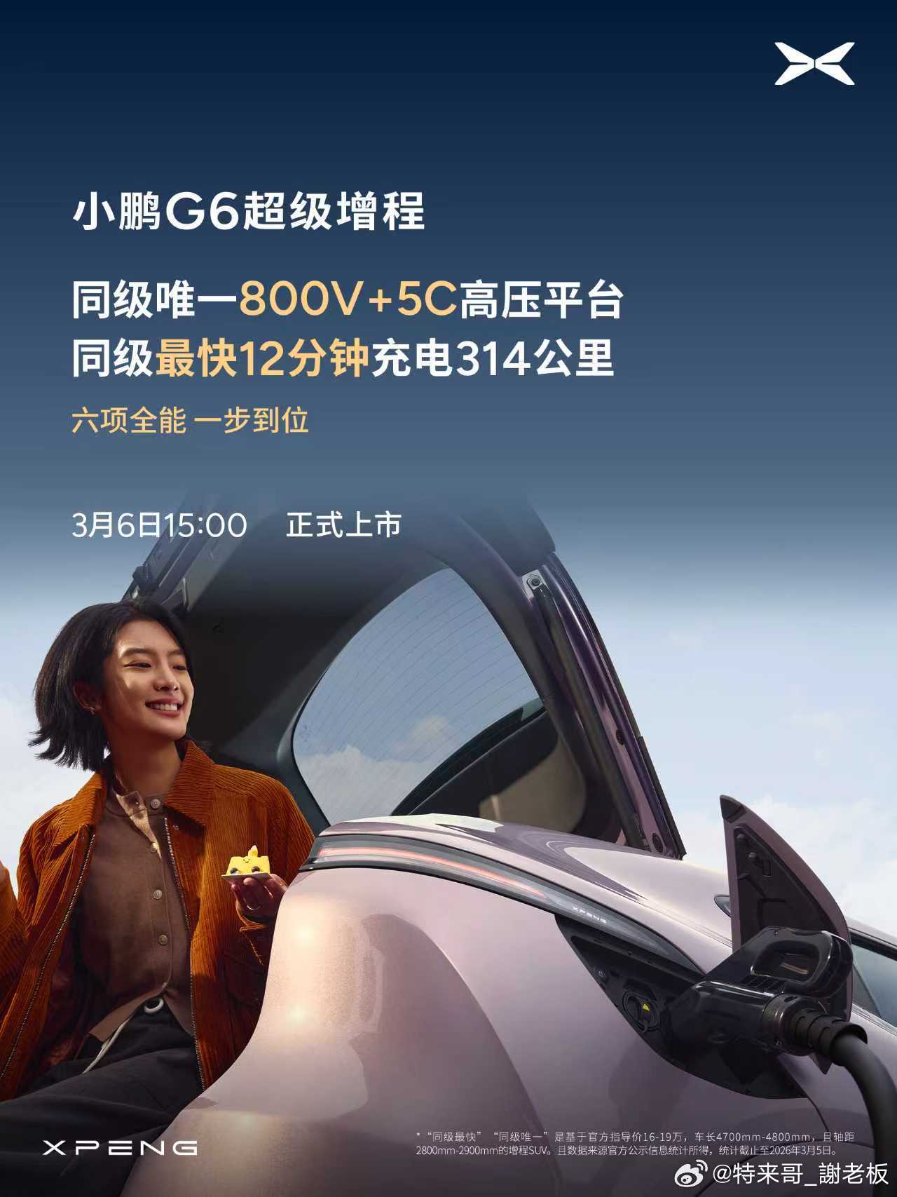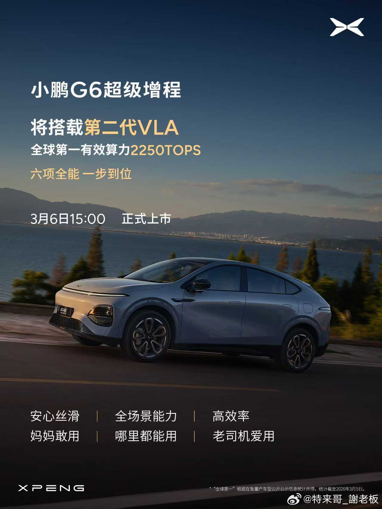 小鹏G6超级增程上市定档3月6日小鹏G6超级增程六项全能一步到位 全球最长续航综合SUV家族再增一员,小鹏G6超级增程官宣明天15:00上市,六项全能一步到位:1、1704km全球最长综合续航,430km同级最长纯电续航;2、2250TOPS全球第一有效算力,将搭载第二代VLA;3、同级唯一800V+5C高压平台,12分钟充电314公里;4、85.6% 同级最大得房率,头部空间超1米;5、同级首个180km/h 爆胎稳行,130km/hAEB刹停、冰雪AES刹停;6、太极AI底盘,标配DCC;