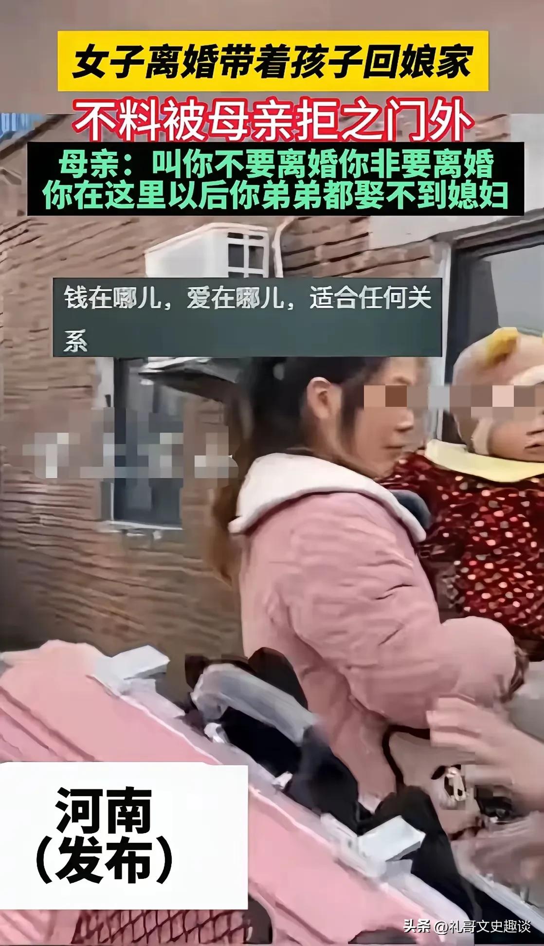 女子离婚回家,被亲妈拒之门外。女子离婚了,还带了一个孩子,无家可归的时候想回娘家住,不料想,她妈妈直接把她挡在门外,不让进家,还把她数落了一顿,说这事怨谁呢? 当时一家人都劝你不要嫁,你任性嫁了。如今有了孩子,生活不下去,要离婚,一家人又劝你不要离婚,你非要离婚。 现在没地方去了,孩子才一岁多,以后咋过,吃啥?这个家你不能进,你要是长期住下去,你弟弟媳妇都娶不上,你自己想办法,你要为你自己的任性买单。 有人说她妈妈很无情,自己女儿不能这样对待,娘家是女人最后的港湾。还有人说父母做的对,不听老人言吃亏在眼前。自己终身大事要谨慎对待,不能脑袋一热就决定了。