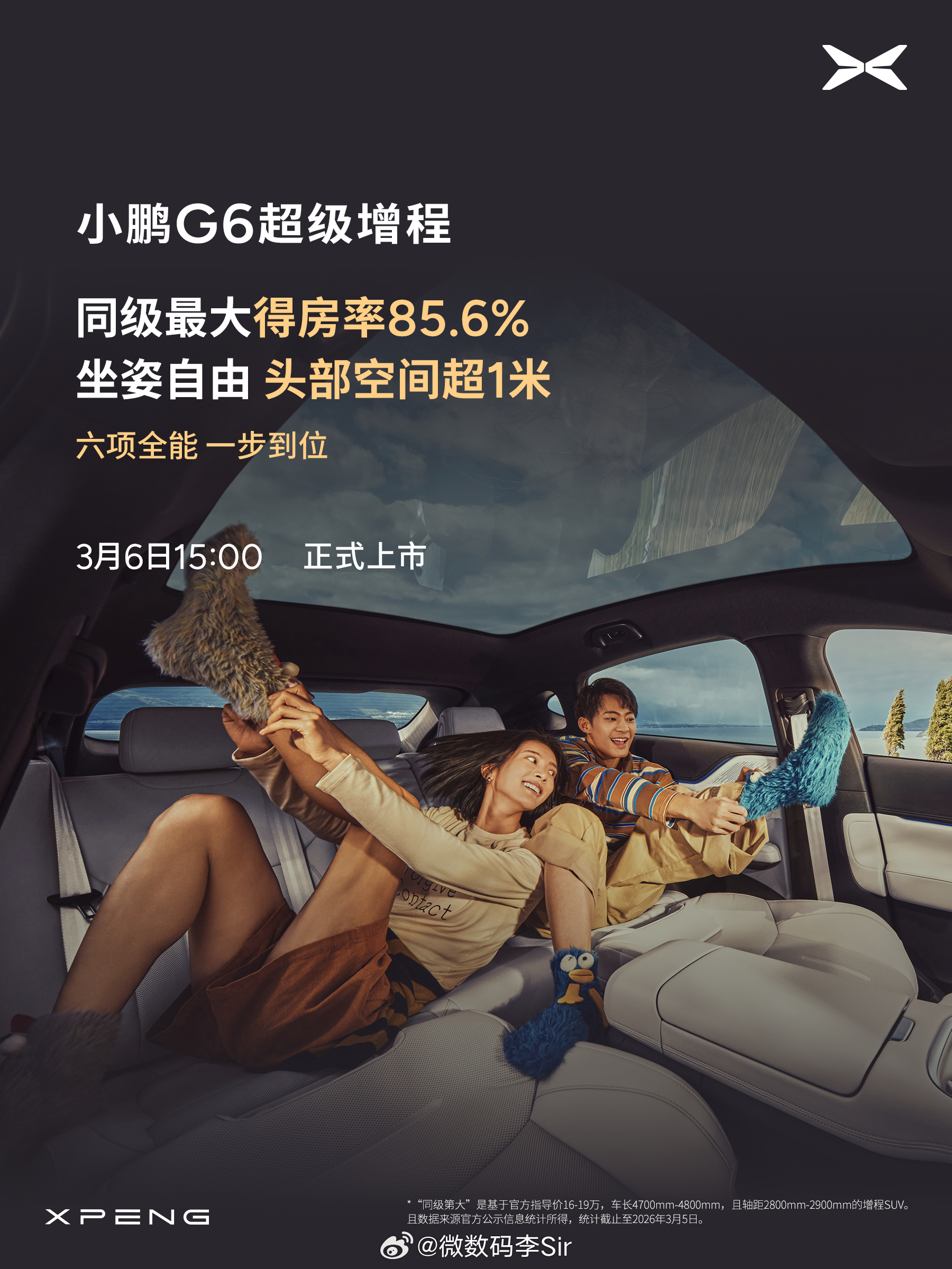 小鹏G6超级增程上市定档3月6日 全球最长续航综合SUV家族再增一员,小鹏G6超级增程官宣明天15:00上市,六项全能一步到位:1、1704km全球最长综合续航,430km同级最长纯电续航;2、2250TOPS全球第一有效算力,将搭载第二代VLA;3、同级唯一800V+5C高压平台,12分钟充电314公里;4、85.6% 同级最大得房率,头部空间超1米;5、同级首个180km/h 爆胎稳行,130km/hAEB刹停、冰雪AES刹停;6、太极AI底盘,标配DCC;小鹏G6超级增程六项全能一步到位