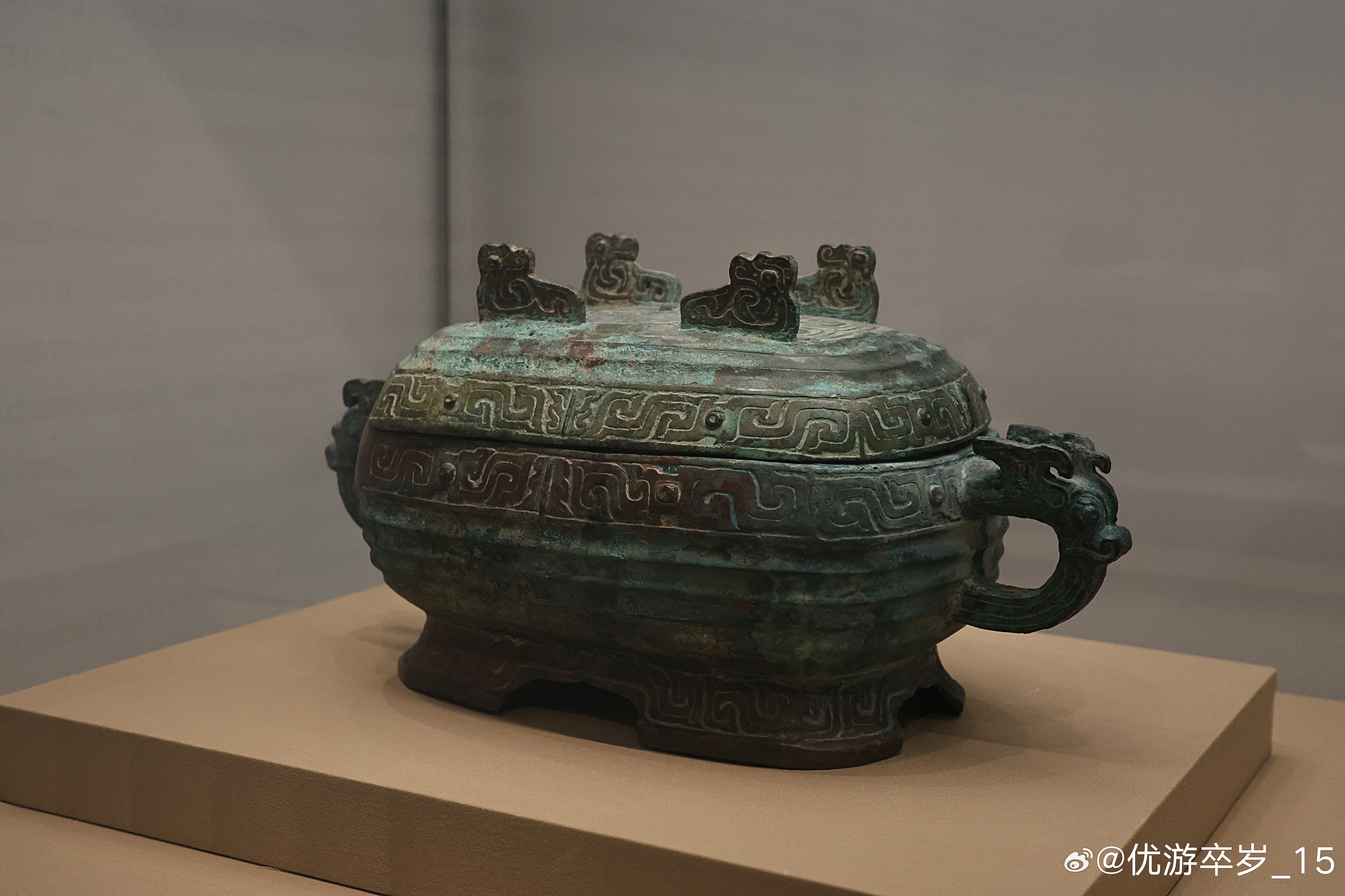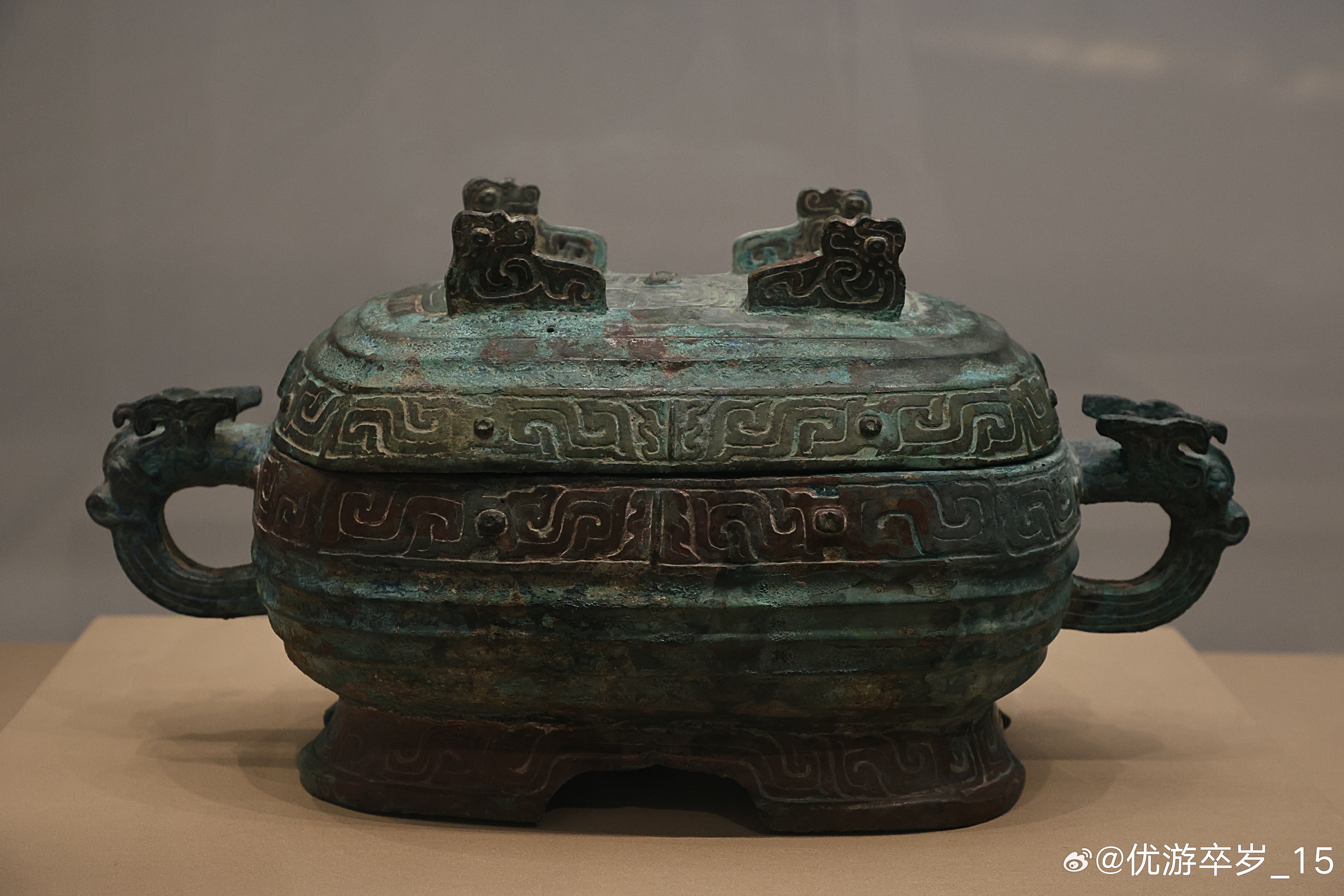 我的2026 【中国之中-中原古代文明精粹】 虢仲铜盨西周(公元前1046-前771年)三门峡市虢国博物馆藏1990年河南三门峡虢国墓地M2009出土。盨,食器和礼器,流行于西周中晚期,在祭祀宴飨是盛放黍稷饭食。此盨呈椭方形,口稍敛,鼓腹圈足,兽首双耳,圈足正中有弧形缺,盖隆起,可以卸置,上有四个不相连接的翼形钮。钮上饰回首夔龙纹,盖沿、器口沿和圈足均饰S形窃曲纹,盖顶和器腹饰瓦垅纹。器盖、器内底有铭文14字:“虢中(仲)乍(作)虢妀(妃)宝盨,子子孙孙永宝用”。是作器者“虢仲”为嫁到虢国的妃姓女子制作的珍贵礼器。属于虢妃的器物陪葬在虢仲的墓中,说明两人关系一定十分密切。清华大学艺术博物馆展出2026.2.8约会博物馆 文物