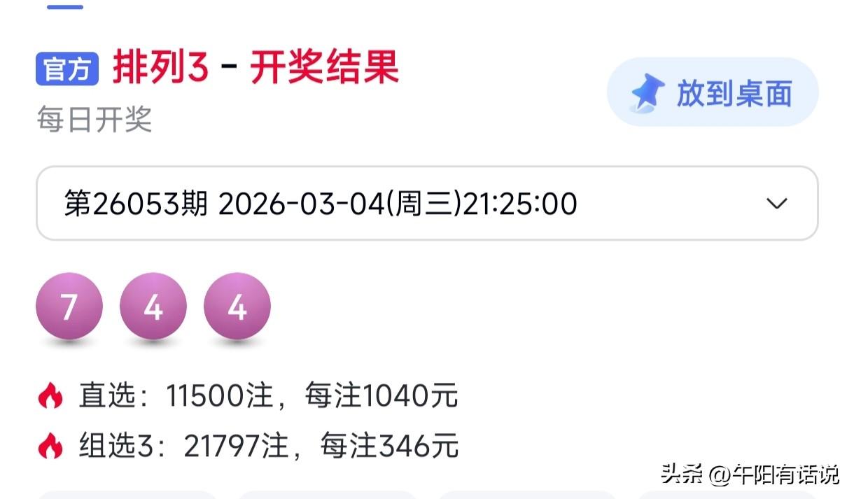 排列三26054期号码共享,重点关注偶数号码继续热开 开奖快讯 排列三26053期开奖号码为:7 4 4 本期开奖号码1路号码出现了爆发,在上期奖号4连开的基础上,搭配号码7组成了全1路号码。最近几期,号码4热度较高,截止本期已连续四期开出,而且本期热度进一步升级,以组三对码形式开出。 本期选号复盘 本期午阳判断1路号码爆发的可能性较大,进行了重点关注。尤其是号码4,午阳判断以对码开出的可能性较大,精选号码胆码,百位、十位和个位均以号码4作为金胆。 精选三注号码分别为4-4-4,4-4-8和4-4-1,结果开出了7-4-4,有点可惜。总结经验,继续加油! 012路号码走势 最近一段时间,1路号码整体走势相对稳定,主要以温态为主。奖号开出数量多围绕一码展开,期间夹杂着断区和两码开出。本期1路号码突然发力,开出了三个奖号,不过由于当前走势并不稳定,预计接下来回冷的概率较大。 组选号码关注 0,2,3,6,8,9 直选号码关注 百位号码:0,3,4,2,8 十位号码:2,6,8,5,0 个位号码:9,8,0,6,2