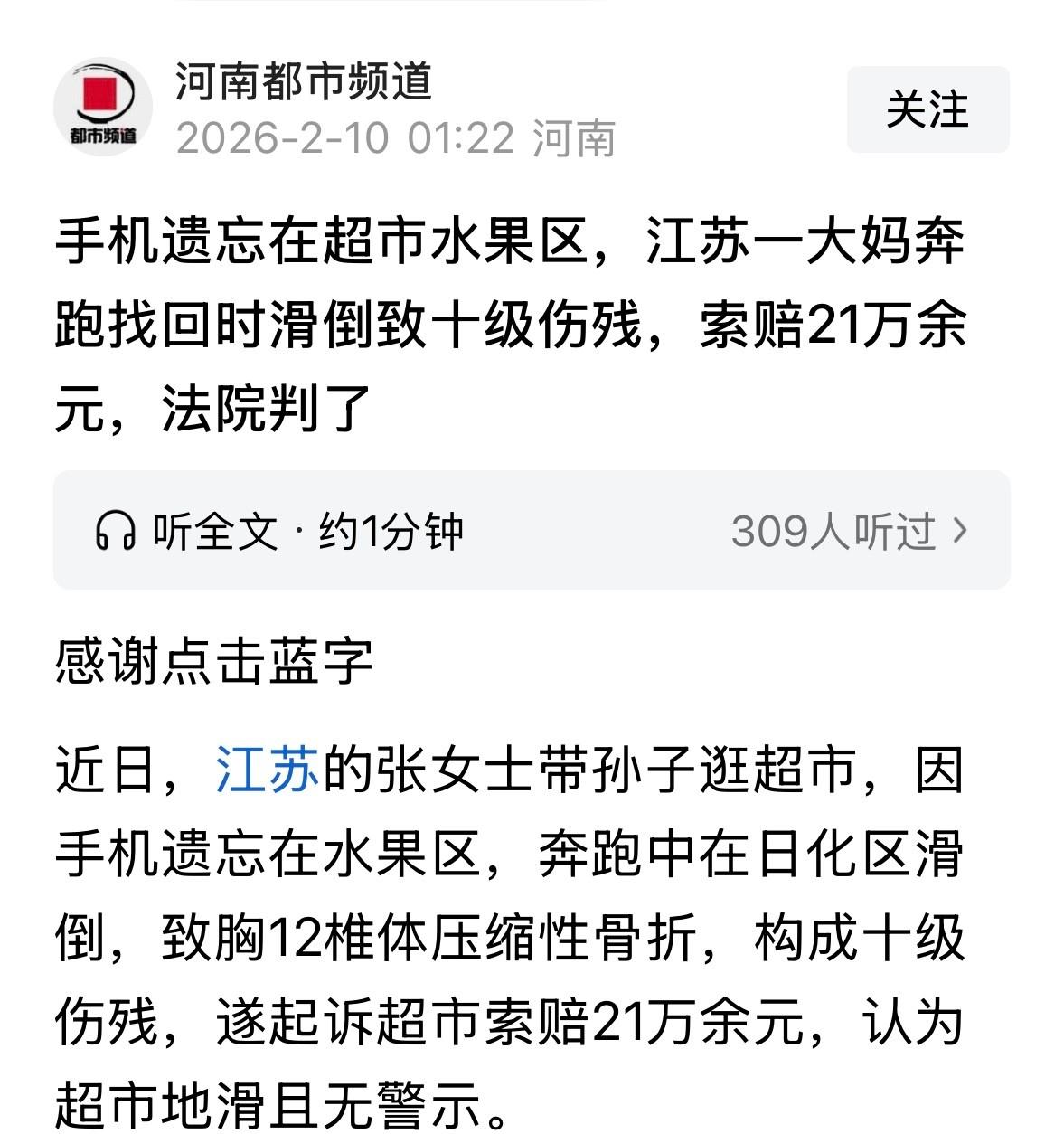 江苏,张阿姨带孙子逛超市时发现手机忘水果区,心急火燎往回跑,结果脚底打滑摔成10级伤残。张阿姨觉得是超市地面有水致自己摔倒,家属便起诉超市索赔21万。超市喊冤,称地面干净,是张阿姨跑太快。庭审时超市拿出监控,法院审理后认为超市安全管理有瑕疵,判其担15%责任,赔3万。这判决让人意外,张阿姨自己不注意,超市却要担责。 事发那天,张阿姨本是陪孙子出来买点水果和日用品。 小孙子在货架间来回穿梭,她一边挑选,一边盯着孩子,手里的手机随手放在水果区的台面上。 结账前摸口袋才发现手机不见了,她这才想起落在原处。 手机里存着家人的联系方式和支付账户,她一时慌神,把孙子托给附近店员照看,转身就往回赶。 超市通道不算宽,她步子迈得很大,注意力都在前方。 跑到日化区附近时,人突然失去平衡,整个人向前栽倒。 摔下去那一下很重,她躺在地上起不来,脸色发白。 工作人员赶来拨打急救电话,又联系了家属。 医院检查结果出来,胸12椎体压缩性骨折,经鉴定构成十级伤残。 十级伤残虽是最轻等级,也意味着日后生活会受影响,阴雨天气可能反复疼痛,重体力活基本无缘。 张阿姨躺在病床上回想摔倒瞬间,认定是地面湿滑所致,还说手掌触地时有潮意。 家属随即整理医疗费、护理费、误工损失等,提出21万元赔偿请求。 超市方面态度强硬,表示事发区域地面干燥,保洁有巡查记录。 庭审中,双方各自提交证据。 超市调出监控视频,画面显示张阿姨在货架间奔跑后摔倒。 不过监控存在死角,无法完整呈现摔倒前地面状态。 法院围绕两点展开审查,一是地面是否存在湿滑隐患,二是张阿姨自身行为是否存在明显过失。 法官认为,经营场所负有安全保障义务,尤其在水果区这类容易产生水渍的区域,应当加强管理和提示。 监控缺失关键画面,超市难以完全证明已尽到充分注意义务。 另一方面,张阿姨作为完全民事行为能力人,在公共场所奔跑,本身存在风险。 她为取回手机急速行走,未对自身安全保持必要注意,是事故发生的直接原因。 依据民法典相关条款,受害人对损害发生有过错的,可以减轻侵权人的责任。 综合双方过错程度,法院判定张阿姨承担85%的责任,超市承担15%的责任。 原本提出的21万元赔偿,最终仅支持3万余元。 判决下来,双方都不算满意。 张阿姨觉得补偿有限,难以覆盖后续康复支出。 超市则认为自身管理并无明显疏漏,却仍需承担部分赔偿。 事情传开后,周围商家开始在通道和生鲜区增设防滑提示牌。 有的超市还在显眼位置张贴请勿奔跑的提醒,尽量减少类似纠纷。 这起纠纷从一部手机开始,最终落在责任比例的分配上。 公共场所的安全保障并非无限责任,个人行为同样会被纳入考量。 一次匆忙奔跑换来几个月康复期,也给经营者和顾客都提了醒。