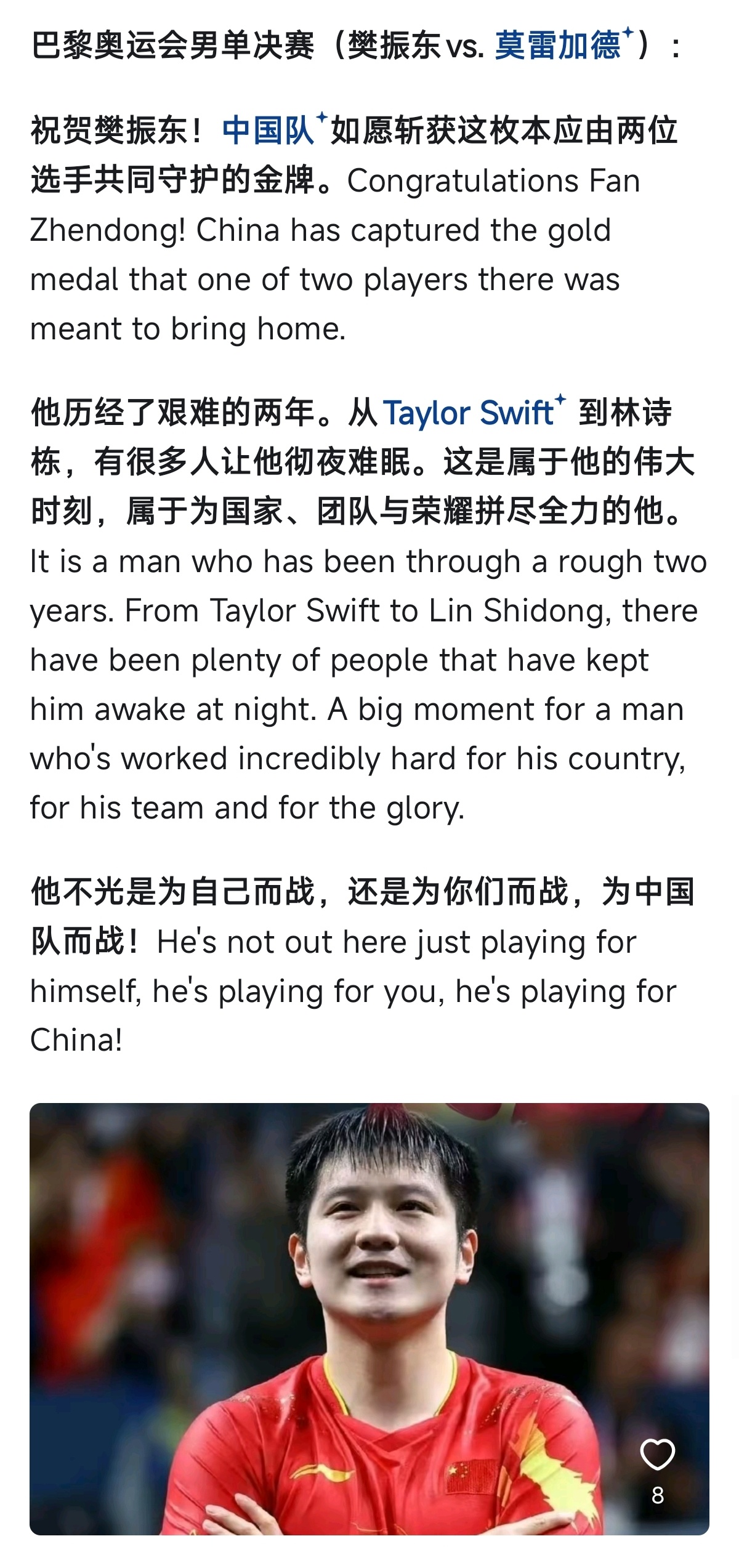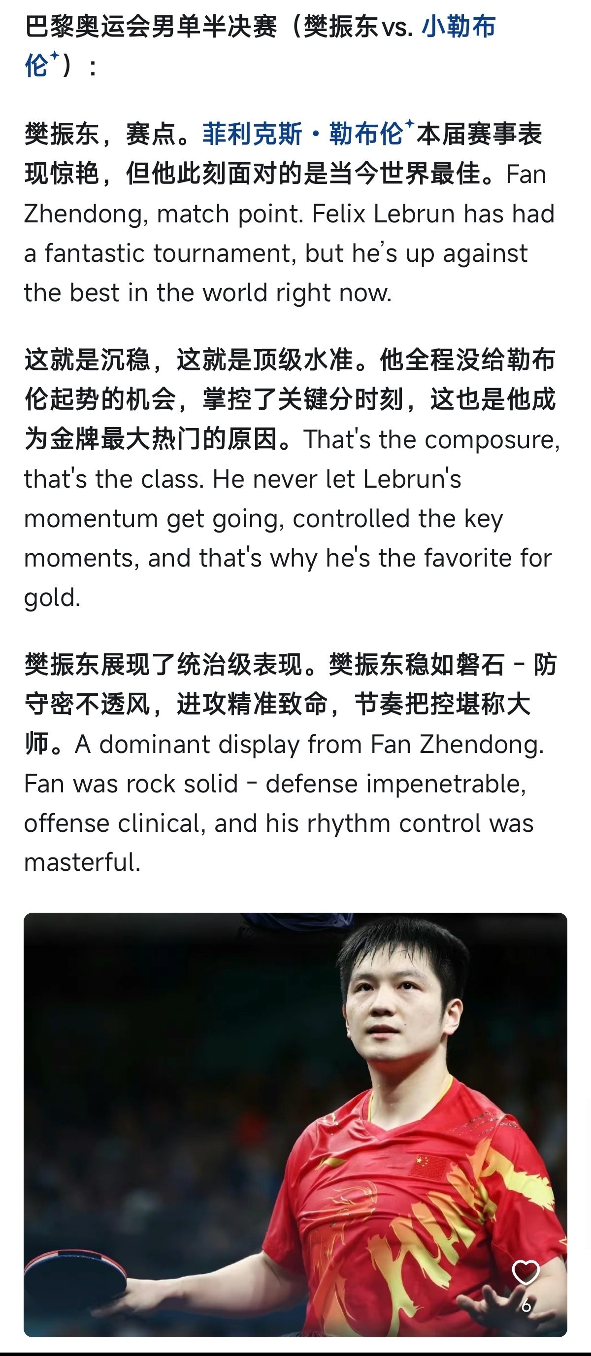 解说员:Adam Bobrow 对樊振东的解析让我在屏幕前更深刻的感受到了樊振东的强大与当时他面对的压力有多重。最后临近结尾处的一些感性解说,太戳我心了。