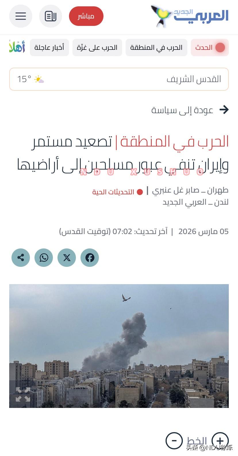 【07】🔴💥🇺🇸🇮🇷🇮🇱美伊以冲突🔹🛑伊朗“召集预备役”做长期战争准备🔹 伊朗战争每天 消耗十亿美元|消息来源:伊拉克新闻 、新阿拉伯报、阿拉伯半岛电视台 ⭕️💥2026年3月5日 周三 战争进入第六天, 美国与以色列持续空袭伊朗,德黑兰近几日的报复主要以美国资产及海湾国家经济设施为目标。以色列占领军周三宣布,自侵略行动开始以来,以色列空军已在对伊朗境空袭中投掷超过5000枚弹药,以色列将在接下来的行动中扩大对伊朗全境的空袭范围,空袭是对伊朗持续军事行动的一部分。 福克斯新闻援引美国官员的话称,数千名伊拉克库尔德武装人员对伊朗发动了地面进攻。阿克西奥斯(Axios)网站则引述美方官员透露,伊朗库尔德民兵已在伊朗西北部发起地面攻势。伊朗武装部队在声明中宣布,已连续打击美国、以色列在该地区的目标。并揭露了其所谓"针对国内安全的敌对阴谋",同时提及在霍尔木兹海峡实施的高技术”封锁"。伊朗烈士基金会周三证实,自开战以来已有1045人丧生。 在与华盛顿谈判问题上,伊朗官员否认了【塔斯尼姆通讯】有关“伊朗向美国传递信息”的报道,称:“伊朗目前不会与美国展开任何对话,德黑兰已做好长期战争准备。” 💥关于伊朗对邻国的袭击,阿联酋宣布拦截了3枚伊朗导弹和121架无人机,另有8架无人机坠落其境内。卡塔尔国防部周三凌晨证实,该国遭到伊朗10架无人机和2枚巡航导弹袭击,卡塔尔埃米尔防空部队成功拦截6架无人机,塔尔埃米尔空军击落2架无人机和2枚巡航导弹,卡塔尔海军则成功拦截剩余2架无人机。 🔹消息人士证实,自战争爆发以来,革命卫队在伊朗政权中的地位大大提升,其领导人现在参与所有重大决策。 🔹《大西洋月刊》援引一位国会官员的话说:五角大楼初步估计,伊朗战争的成本为每天 10 亿美元。 一位伊朗军方官员表示,如果美国和以色列企图通过武装混乱推翻该政权,迪莫纳反应堆(Dimona Reactor)将成为攻击目标。 伊朗军队总司令阿米尔·哈塔米少将向军队下令,进行“预备役人员”的召回,以应对“持久战” 🔹路透社援引阿曼石油营销公司消息:该公司的一个燃料储存罐发生事故。 🔹 伊拉克巴格达维多利亚基地发生爆炸 🔹 伊朗伊斯兰革命卫队(IRGC)宣布使用高超音速导弹和攻击无人机袭击了以色列国防部和本古里安机场。
