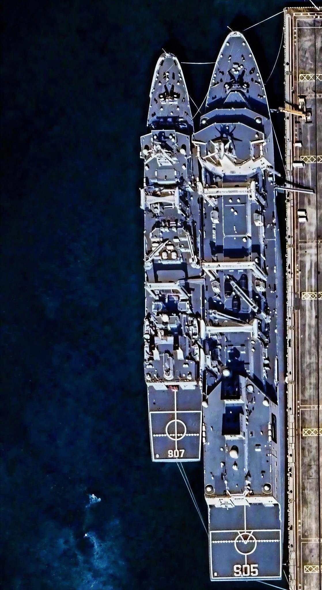 这张航拍图中的两艘军舰是中国海军现役的远洋综合补给舰。 右侧是舷号为905的901型综合补给舰查干湖号。 该舰是901型大型快速综合补给舰的二号舰,满载排水量约4.8万吨,被形象的称为航母编队的“超级奶妈”。它最高航速不低于25节,可全程伴随航母战斗群执行远洋任务,具备横向、纵向、垂直多维度补给能力,可同时为多艘舰艇补给燃油、弹药、干货、淡水等各类物资,是中国海军航母编队远洋作战体系的核心后勤保障力量,于2019年正式入列服役。 左侧是舷号为907的903A型综合补给舰骆马湖号。 该舰满载排水量约2.3万吨,是中国海军远海行动的主力补给舰。该舰2015年下水,2016年正式加入南海舰队服役,具备成熟的横向、纵向和直升机垂直补给能力,可同时为多艘驱护舰提供液货、干货补给,已经多次执行亚丁湾护航、远海联合训练等重大任务,目前是中国海军驱护舰编队远洋部署的核心后勤支撑。 这张航拍图直观的展现了两型补给舰的定位差异。4万吨级的901型主打航母编队伴随补给,2万吨级的903A型主打驱护舰编队远洋补给,二者共同构成了中国海军完善的远洋补给体系。