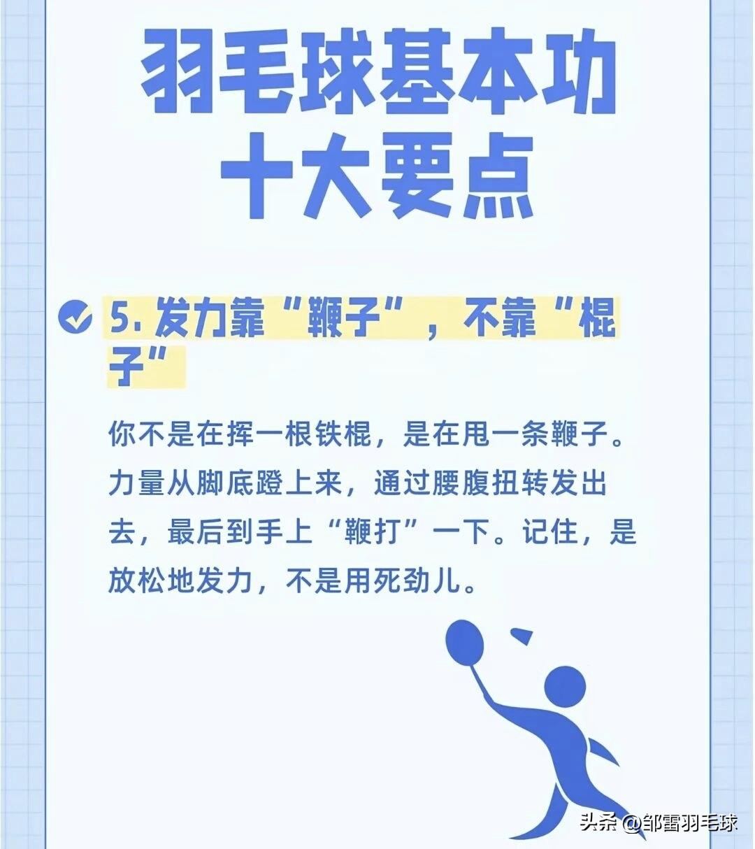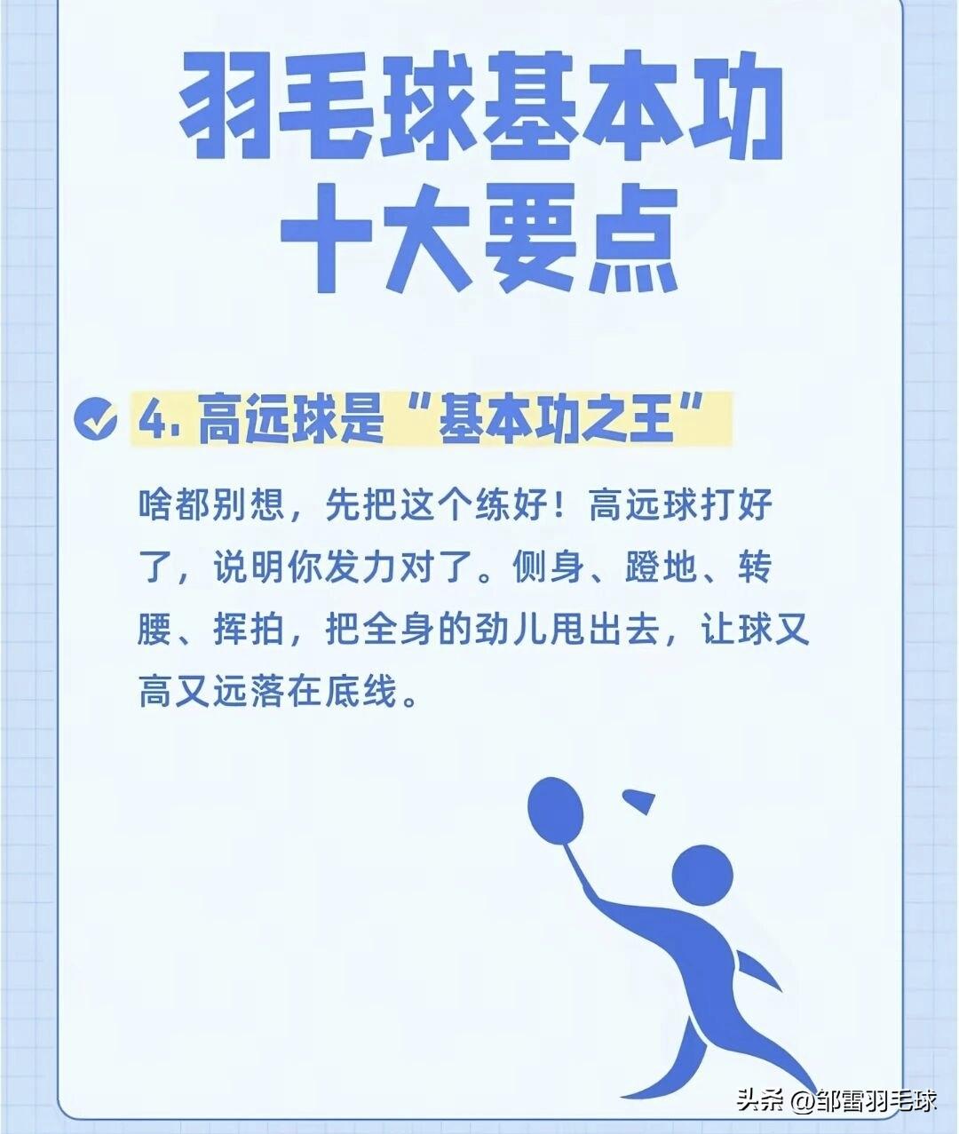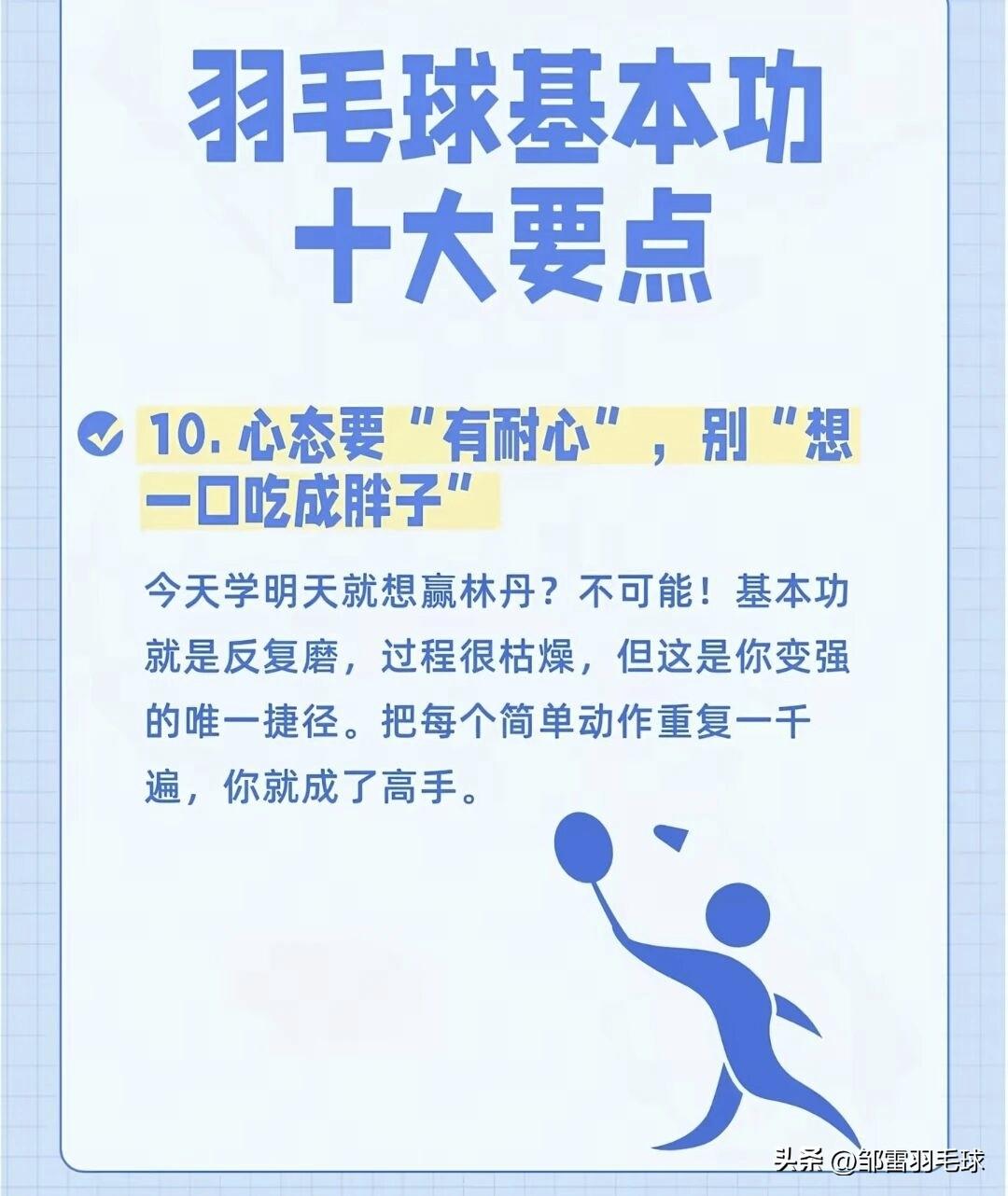 羽毛球基本功十大要点(图文版) 这组图片用生动的比喻,把羽毛球基本功拆解成了10个核心要点,非常适合新手入门和老手复盘: 1. 握拍是“开门的钥匙” 正确握拍像“握手”,虎口对准拍柄侧棱,手心留空,避免“死攥”。握拍是所有技术的起点,姿势错了,后续技术都会变形。 2. 架拍是“进攻的号角” 准备接球时要主动举拍,提升气势和反应速度,避免球拍下垂导致被动。 3. 步法是“球场的生命线” 羽毛球是“用脚打的”,优先练熟“米字步法”,确保“球到人到”,避免伸手够球。 4. 高远球是“基本功之王” 侧身、蹬地、转腰、挥拍,用全身力量打出又高又远的底线球,是检验发力是否正确的关键。 5. 发力靠“鞭子”,不靠“棍子” 力量从脚蹬地开始,经腰腹扭转传递到手臂,最后用手腕“鞭打”发力,放松而非用死力。 6. 击球点要“抢高点” 主动迎球,在右肩前上方最高点击球,这个位置发力最顺、球质最好,能大幅提升进攻威胁。 7. 网前球靠“手感”,不靠“蛮力” 网前比拼的是细腻度,用手腕和手指的轻微抖动让球贴网而过,比大力出界更具杀伤力。 8. 眼睛要“盯人”,别光“盯球” 击球后立刻观察对手的动作和拍面,预判回球方向,提前占位,掌握主动权。 9. 重心要“压下去”,别“站着戳” 膝盖微弯、重心降低,像猎豹一样随时准备启动,才能快速移动、应对各种来球。 10. 心态要“有耐心”,别“想一口吃成胖子” 基本功需要反复打磨,枯燥的重复是变强的必经之路,把每个简单动作练到极致,自然会成为高手。 羽毛球 羽毛球爱好者 羽毛球技巧 羽毛球比赛 羽毛球基础技术图解羽毛球赛事 石宇奇 林丹