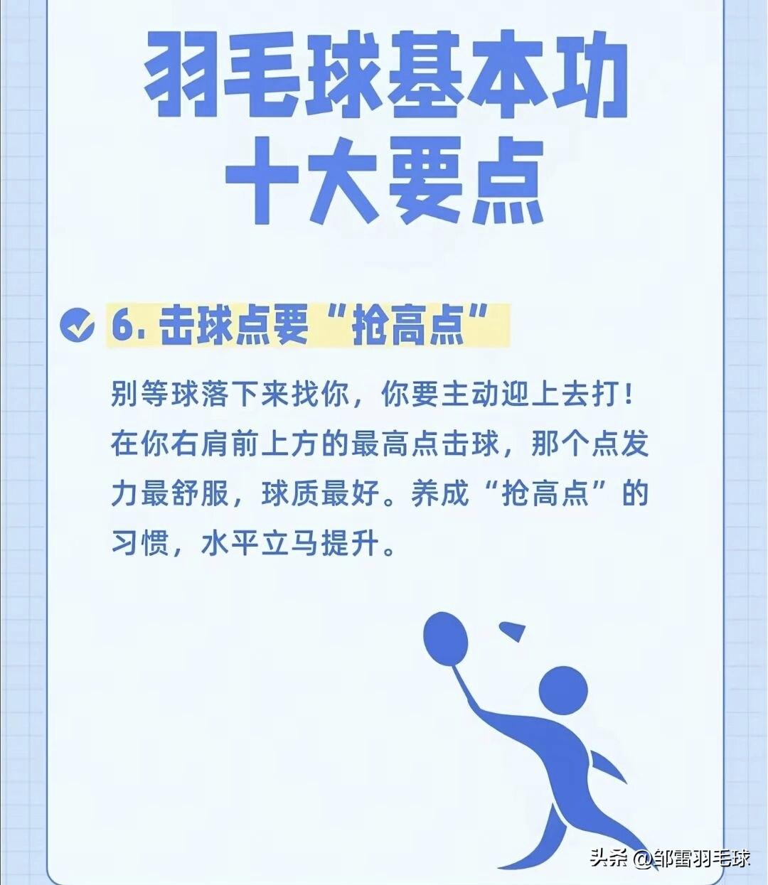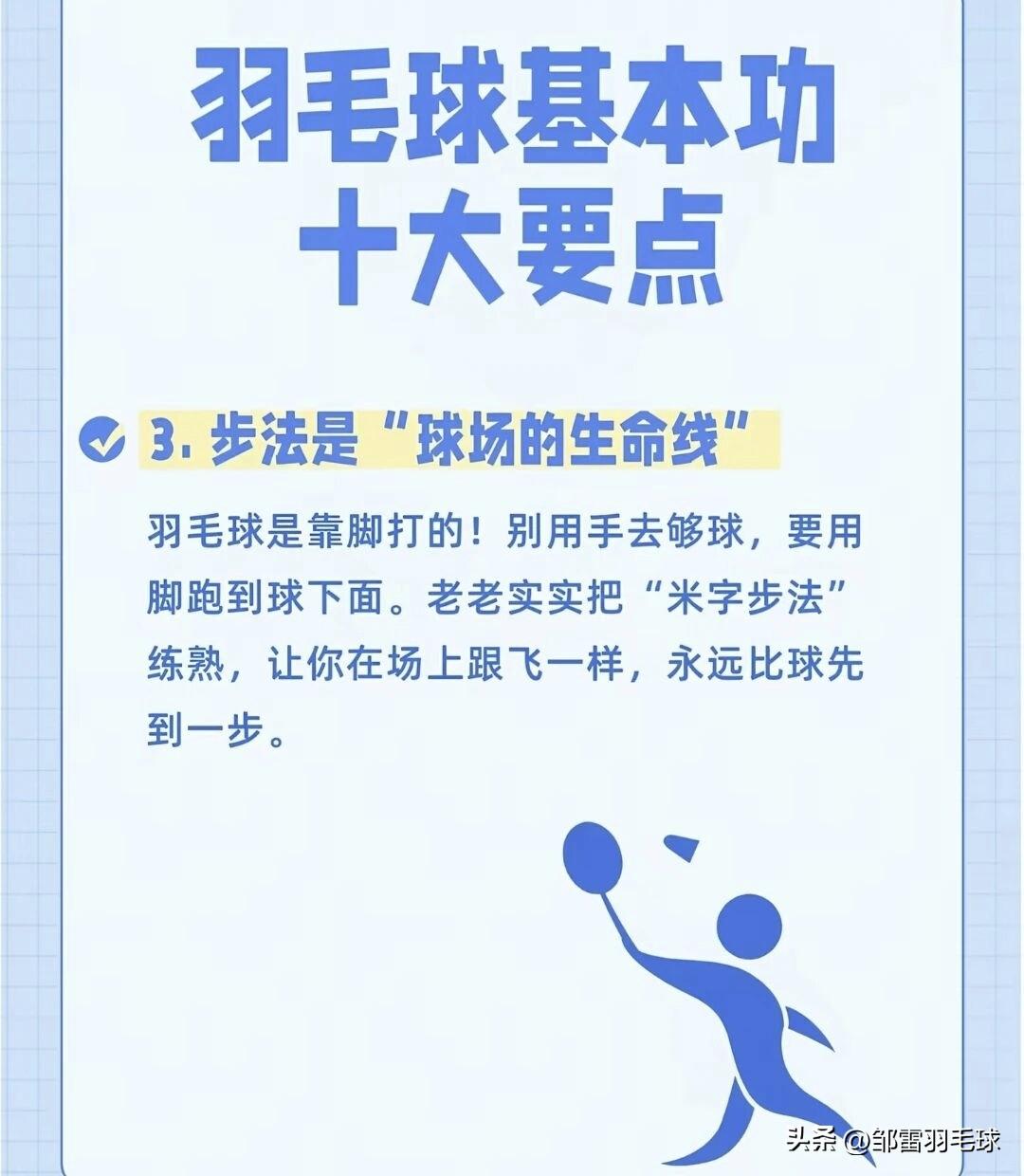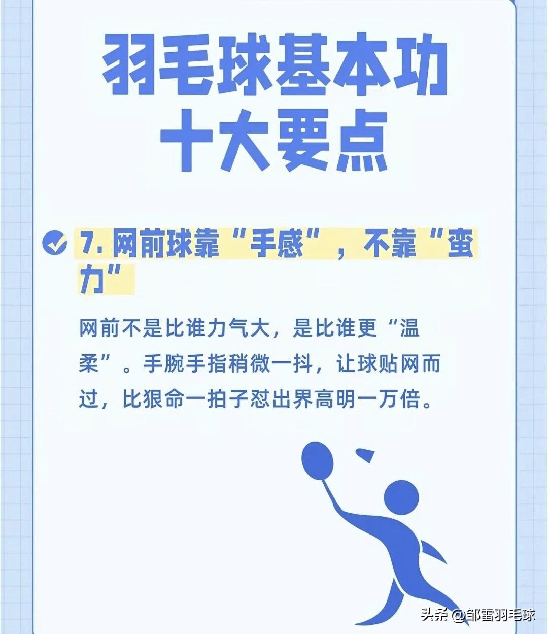 羽毛球基本功十大要点(图文版) 这组图片用生动的比喻,把羽毛球基本功拆解成了10个核心要点,非常适合新手入门和老手复盘: 1. 握拍是“开门的钥匙” 正确握拍像“握手”,虎口对准拍柄侧棱,手心留空,避免“死攥”。握拍是所有技术的起点,姿势错了,后续技术都会变形。 2. 架拍是“进攻的号角” 准备接球时要主动举拍,提升气势和反应速度,避免球拍下垂导致被动。 3. 步法是“球场的生命线” 羽毛球是“用脚打的”,优先练熟“米字步法”,确保“球到人到”,避免伸手够球。 4. 高远球是“基本功之王” 侧身、蹬地、转腰、挥拍,用全身力量打出又高又远的底线球,是检验发力是否正确的关键。 5. 发力靠“鞭子”,不靠“棍子” 力量从脚蹬地开始,经腰腹扭转传递到手臂,最后用手腕“鞭打”发力,放松而非用死力。 6. 击球点要“抢高点” 主动迎球,在右肩前上方最高点击球,这个位置发力最顺、球质最好,能大幅提升进攻威胁。 7. 网前球靠“手感”,不靠“蛮力” 网前比拼的是细腻度,用手腕和手指的轻微抖动让球贴网而过,比大力出界更具杀伤力。 8. 眼睛要“盯人”,别光“盯球” 击球后立刻观察对手的动作和拍面,预判回球方向,提前占位,掌握主动权。 9. 重心要“压下去”,别“站着戳” 膝盖微弯、重心降低,像猎豹一样随时准备启动,才能快速移动、应对各种来球。 10. 心态要“有耐心”,别“想一口吃成胖子” 基本功需要反复打磨,枯燥的重复是变强的必经之路,把每个简单动作练到极致,自然会成为高手。 羽毛球 羽毛球爱好者 羽毛球技巧 羽毛球比赛 羽毛球基础技术图解羽毛球赛事 石宇奇 林丹
