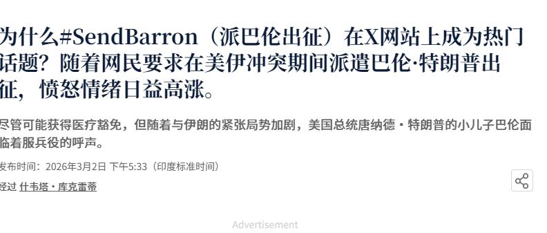 “请特朗普派19岁的儿子巴伦与美军一起对抗伊朗吧”!美国网友呼吁特朗普派他的儿子巴伦前往伊朗战场,一度冲上全球热搜。 最近特朗普联合以色列打击伊朗,美国国内炸了锅,不是支持,而是反对声一片,纽约、旧金山等几十个城市的民众集体游行,举着标语喊着要停止对伊朗的战争,说这场仗只会带来死亡和混乱,是对人类的犯罪。 就在反战情绪高涨的时候,有人在社交媒体上带起了节奏,核心意思很简单:既然特朗普要发动战争,要让美国年轻人去前线送死,那他自己的儿子凭什么躲在后方享清福? 于是,“让巴伦参战”的话题迅速发酵,短短两天就冲到了全球热搜,网友的评论更是一边倒,有人说“公平起见,总统的儿子也该为国效力”,也有人直接戳破本质,说这就是对特朗普双重标准的嘲讽。 可能很多人对巴伦不太了解,他是特朗普60岁时和梅拉尼娅生的小儿子,从小就被宠成了“亿万美元宝贝”。 小时候住特朗普大厦的顶层,游戏房占一整层,玩具都是全球限量款,上学读的是全美顶级的私立学校,就连上纽约大学,每天都有黑色SUV车队护送,教室最后一排永远有特工守着,连同学想和他打个篮球都被拒绝。 说起来,巴伦这一辈子,几乎都活在父亲的光环和争议里,小时候因为特朗普竞选总统,他被造谣患有自闭症,梅拉尼娅在回忆录里说,那种感觉太残忍,造谣的人只是因为不喜欢特朗普,就把怒火发泄在一个孩子身上。 后来他慢慢长大,身高长到两米,成了媒体追逐的焦点,连上学路上被偷拍、校园里被围观都成了常态,甚至有同学因为随口评价他“像个怪人”,就被施压辞职。 可现在,这个一直被家人严密保护、从未涉足过政治和军事的19岁少年,却被网友推到了战争的风口浪尖。 有人可能觉得,这只是网友的一时兴起,可背后藏着的,是美国民众对特朗普政府的不满,更是对“精英特权”的反抗。 大家可以细想一下,特朗普一贯喜欢拿家人做文章,当年巴伦感染新冠,他轻描淡写地说“没事,年轻人免疫力强”,还借着这事呼吁重开校园;他夸赞巴伦对政治有兴趣,能给自己出谋划策,却从没想过,真要到了为国效力的时候,他会不会舍得让这个从小宠到大的小儿子去战场冒险。 更讽刺的是,特朗普一边喊着要打击伊朗,一边却在3月3号抨击西班牙“不合作”,甚至宣布要切断和西班牙的所有贸易往来,丝毫没考虑过战争会给美国民众带来什么。 而那些喊着让巴伦参战的网友,其实也不是真的想让一个19岁的孩子去送死,他们只是想问问特朗普:你口中的“为国牺牲”,是不是只针对普通人家的孩子?你的家人,是不是就可以例外? 截至目前,特朗普和梅拉尼娅都没有正面回应“让巴伦参战”的话题,但熟悉特朗普的人都知道,他向来擅长转移话题,大概率不会正面回应这个两难的问题。 毕竟,真要同意,他舍不得自己的小儿子;真要拒绝,又会被网友抓住把柄,说他双重标准、自私自利。 站在我们中国人的角度看这件事,其实挺唏嘘的,一场还没全面爆发的战争,最先被推出来的,竟然是一个刚成年的孩子;一个国家的总统,一边煽动战争,一边却护着自己的家人,而普通民众只能用这种极端的方式,表达自己的不满和反抗。 说到底,“让巴伦参战”的热搜,从来都不是一场针对巴伦个人的闹剧,而是美国社会矛盾的集中爆发——反战情绪、精英特权、政治作秀,所有的一切,都藏在这个看似荒诞的话题里。 大家对此有什么看法呢?欢迎各位在评论区留言!