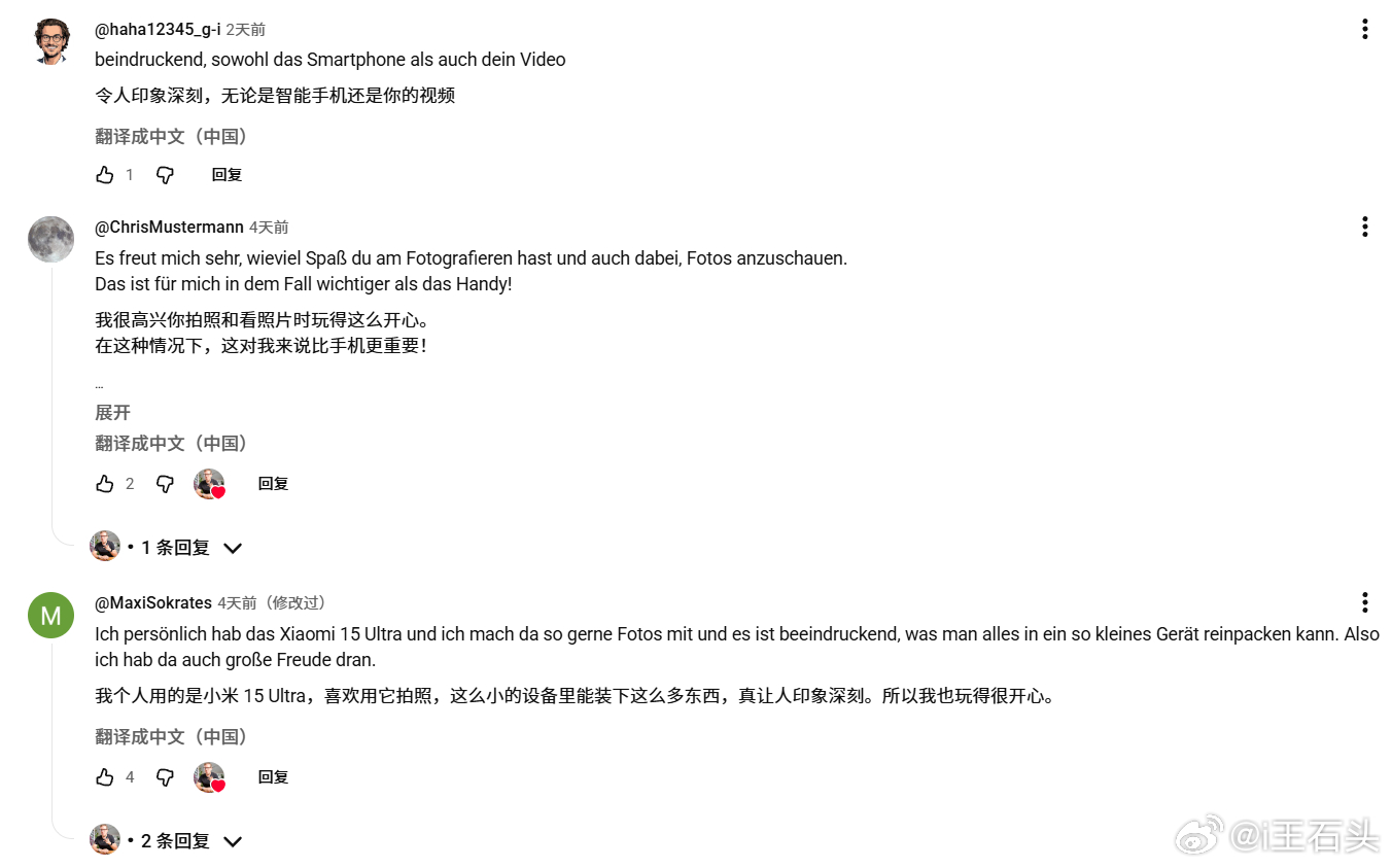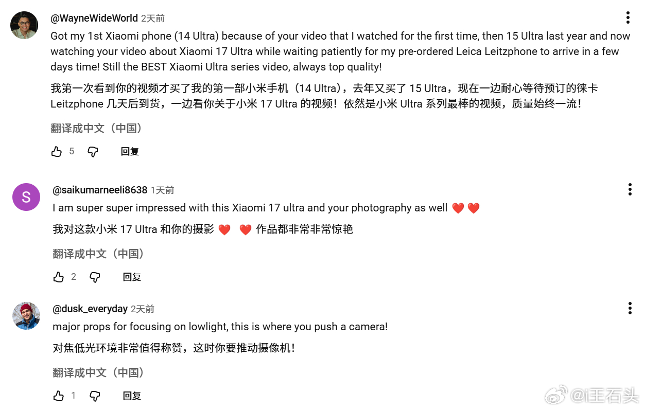 海外的Leitzphone,也就是小米17 Ultra徕卡版。记得两个月前上市时,喷子们挺多的。。。现在看看油管上的评论,这是我随便点开的几个视频评论。在国际市场,小米的口碑就这样,看来一时半会儿应该倒不了。小米小米17Ultra