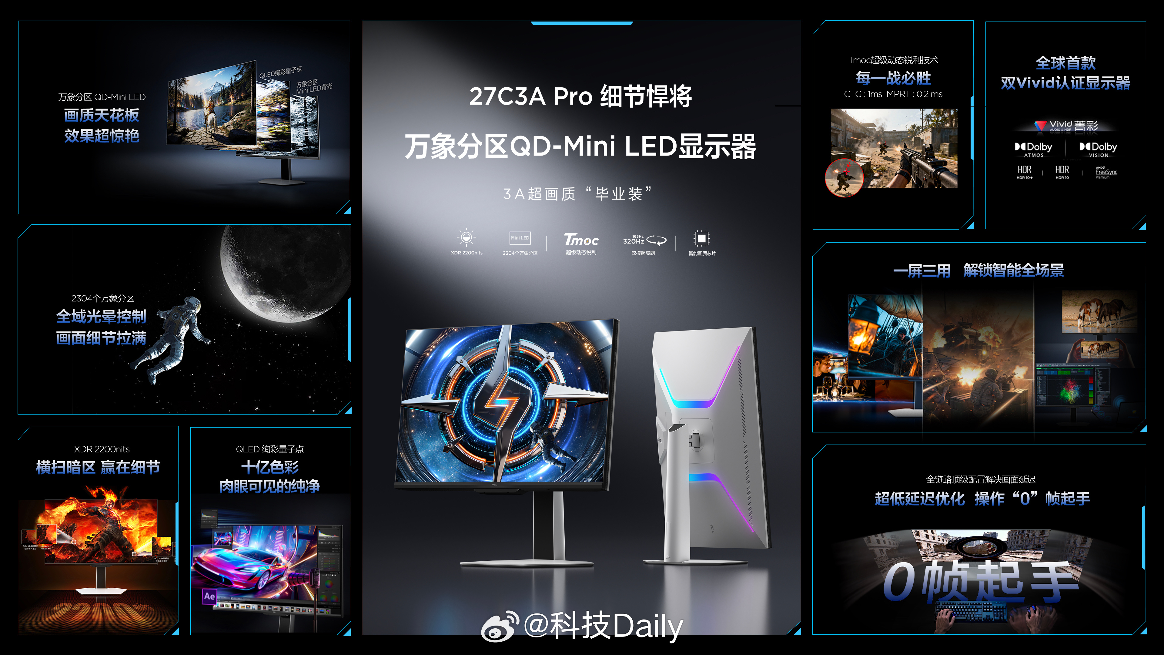 TCL新款显示器登场。X3A、C3A Pro、P2A Ultra分别搭载OLED+、QD-Mini LED技术,更有1040Hz超高刷产品,惊艳十足。