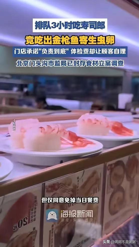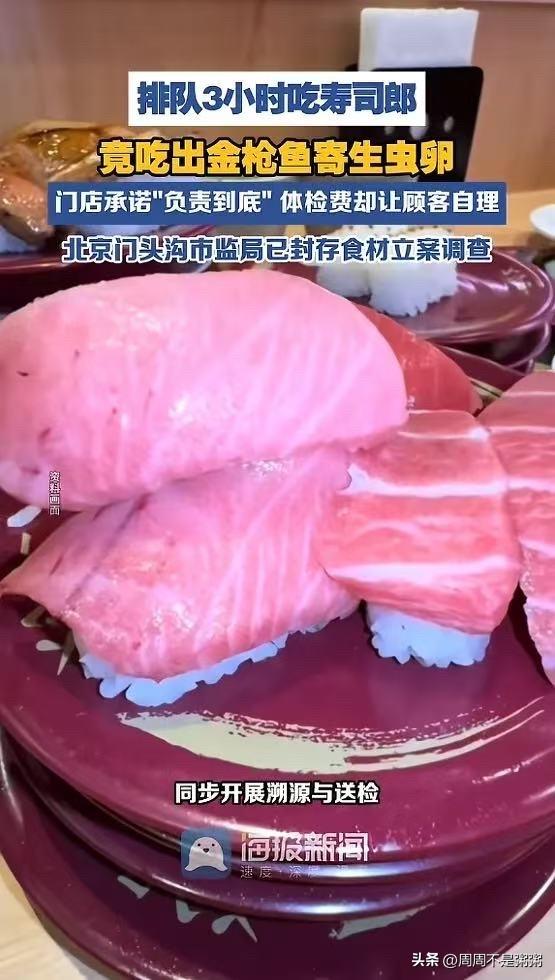 “顾客天塌了!”3月1日,一女子去门店就餐,排了3小时队终于轮到自己,没想到在吃金枪鱼时,却发现有寄生虫卵,这把女子吓了一跳,当即向门店反映,门店称会负责相关赔偿,但仅同意免掉当日餐费,体检费要顾客先自付!网友:太膈应了! 这事儿就发生在北京门头沟区长安天街商场里的某餐厅。那天是周六,店里人挤人,女孩排了整整三个小时才吃上。好不容易坐下来,夹起一块金枪鱼刺身,送到嘴边时却愣住了。鱼肉上粘着一些白色小点,看着就让人头皮发麻。 她赶紧叫来服务员。店里的主管过来看了,也承认这确实是虫卵。主管嘴上说得挺好听,承诺如果因为吃了这个导致身体出问题,他们会负责到底。可当女孩提出,想先去医院做个全面检查,图个安心时,店方的态度就变了。 主管说,今天的餐费可以全免,但体检的钱得顾客自己先垫着。等检查出来,真有问题,而且是他们的鱼导致的,他们再赔。这话听着好像有点道理,可仔细一想,不对味儿。吃出虫卵的是你们店里的东西,消费者心里害怕,想去检查一下,这钱还得自己先掏?万一检查出问题,后续扯皮怎么办? 女孩把这段经历发到了网上,视频一下子火了。谁花钱吃饭不想图个安心,结果变成开“寄生虫盲盒”,换谁都受不了。更让人后怕的是,这可不是普通的脏东西,是寄生虫卵啊。 很多人爱吃生鱼片,觉得深海鱼干净。其实不然,像金枪鱼、三文鱼这类海鱼,体内很可能携带异尖线虫等寄生虫。这些虫子肉眼很难发现,吃进肚子后,轻的引起腹痛、恶心、呕吐,严重的可能引发过敏,甚至钻入消化道壁,造成更深的伤害。 正规的餐饮店,对于要做刺身的鱼肉,都有严格的处理标准。通常需要在零下20度冷冻至少7天,或者零下35度冷冻15小时以上,才能有效杀死这些寄生虫幼虫。餐厅作为一家大型连锁店,后厨的冷冻处理环节是不是到位了?这是大家最关心的问题。 事情闹大后,北京市门头沟区市场监督管理局动作很快。3月4号就发了通报,说已经去现场检查,封存了店里剩下的同批次金枪鱼肉,正式立案调查。监管部门的介入,总算给了消费者一个盼头。 这件事说到底,不是免一单饭钱就能解决的。它暴露的是餐饮企业食品安全管理的漏洞,和对消费者健康权、知情权的轻视。顾客要的不是事后的一句“负责到底”,而是事前的严格把关,和出事后的主动担当。排队三小时吃出的不是美味,是风险,这谁受得了? 希望这次调查能有个明确的结果,也给所有做生食的餐厅提个醒:新鲜美味的前提,永远是安全。别让顾客的信任,败给几颗不该出现的虫卵。 各位读者你们怎么看?欢迎在评论区讨论。