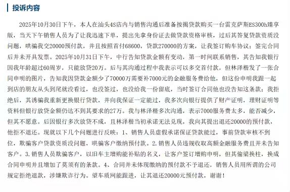 【315 汽车维权】雷克萨斯 ES 深陷定金陷阱,阴阳合同 + 强吞定金套路多 雷克萨斯 ES 经销商频现购车套路,定金纠纷成重灾区!汕头、洛阳、江门多地车主中招,销售为促单口头承诺贷款批不下来全额退定金,诱导车主交 2 万定金后,银行拒贷却以 “买方违约” 强吞定金;还有经销商签订阴阳合同,隐瞒真实利率,给银行和车主的合同不一致,凭空增加 1-4 万金融服务费,收据还偷偷将可退的 “订金” 写成不可退的 “定金”。依据《消费者权益保护法》,商家欺诈可撤销合同,车主不仅能要求退款,还可主张退一赔三!提醒购车承诺务必写进合同!
