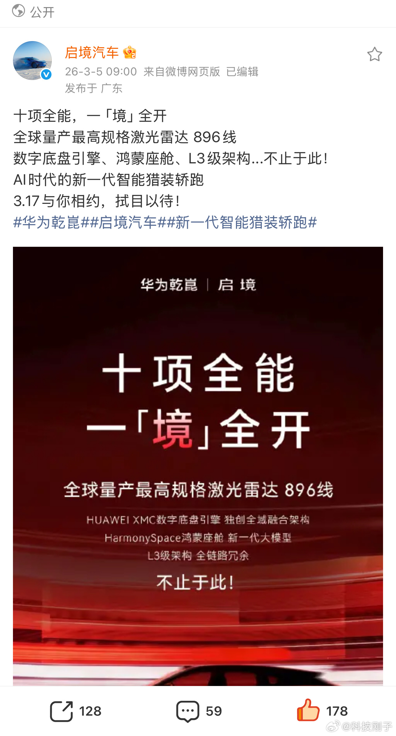 启境首款猎装轿跑或命名7系列华系首款猎装轿跑启境即将亮相昨天尊界S800首发华为新一代激光雷达炸场,启境今天就放了“一境全开”的海报看懂时间的都知道,启境这台新车已经确认和尊界技术同源。开启猎装轿跑智能化时代,造就了百万颜值,这台华系首款智能猎装轿跑,确定全栈搭载“华为新一代智能技术”,同级唯一的华为乾崑智驾L3级架构打底加上华为新一代双光路图像级激光雷达。想体验百万级驾控的全能体验,价格期待直接拉满,启境首款猎装轿跑,这台好车必须3月17日蹲一波!