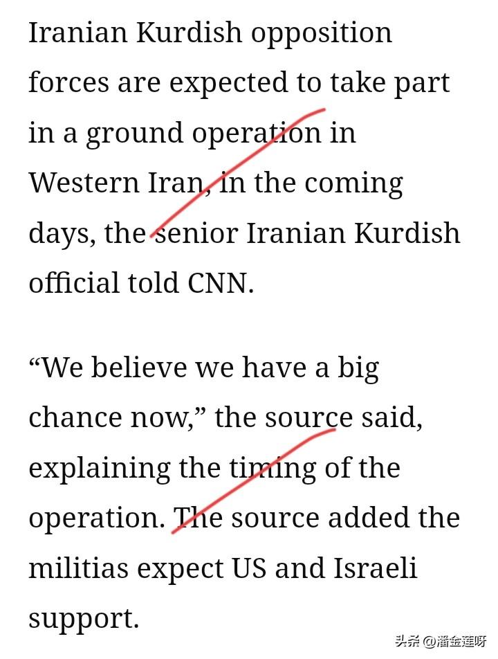 更新 在伊朗边境活动着一个武装力量~~库尔德武装。 川普希望借助这支武装力量对伊朗发起地面进攻。 有消息称,美中情局开始为库尔德武装提供武器、情报、资金。 以色列也口头给伊朗的库尔德人“画了一个很大的饼”~~建设一个新伊朗,在新伊朗里自治。 至于这些库尔德人能不能吃到以色列为其画的这个沾着奶油与蜂蜜的大饼,天知道。🤷 目前,还没有伊朗库尔德人打击伊朗的视频流出。 美以联合袭击伊朗 伊朗
