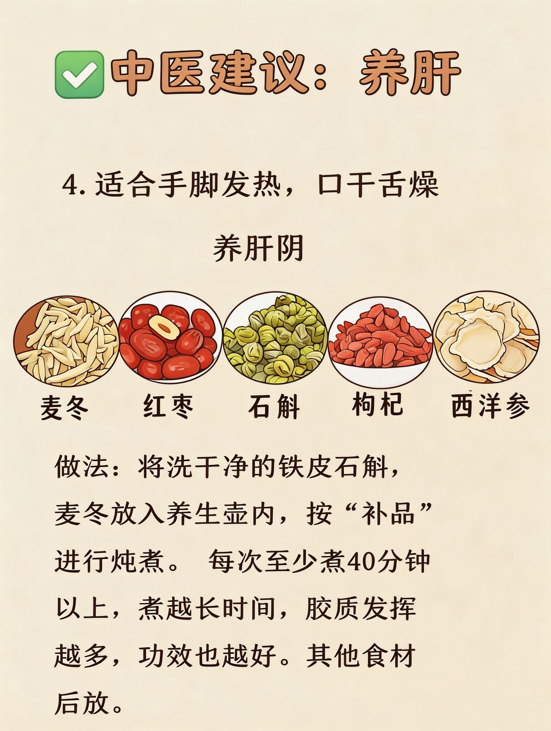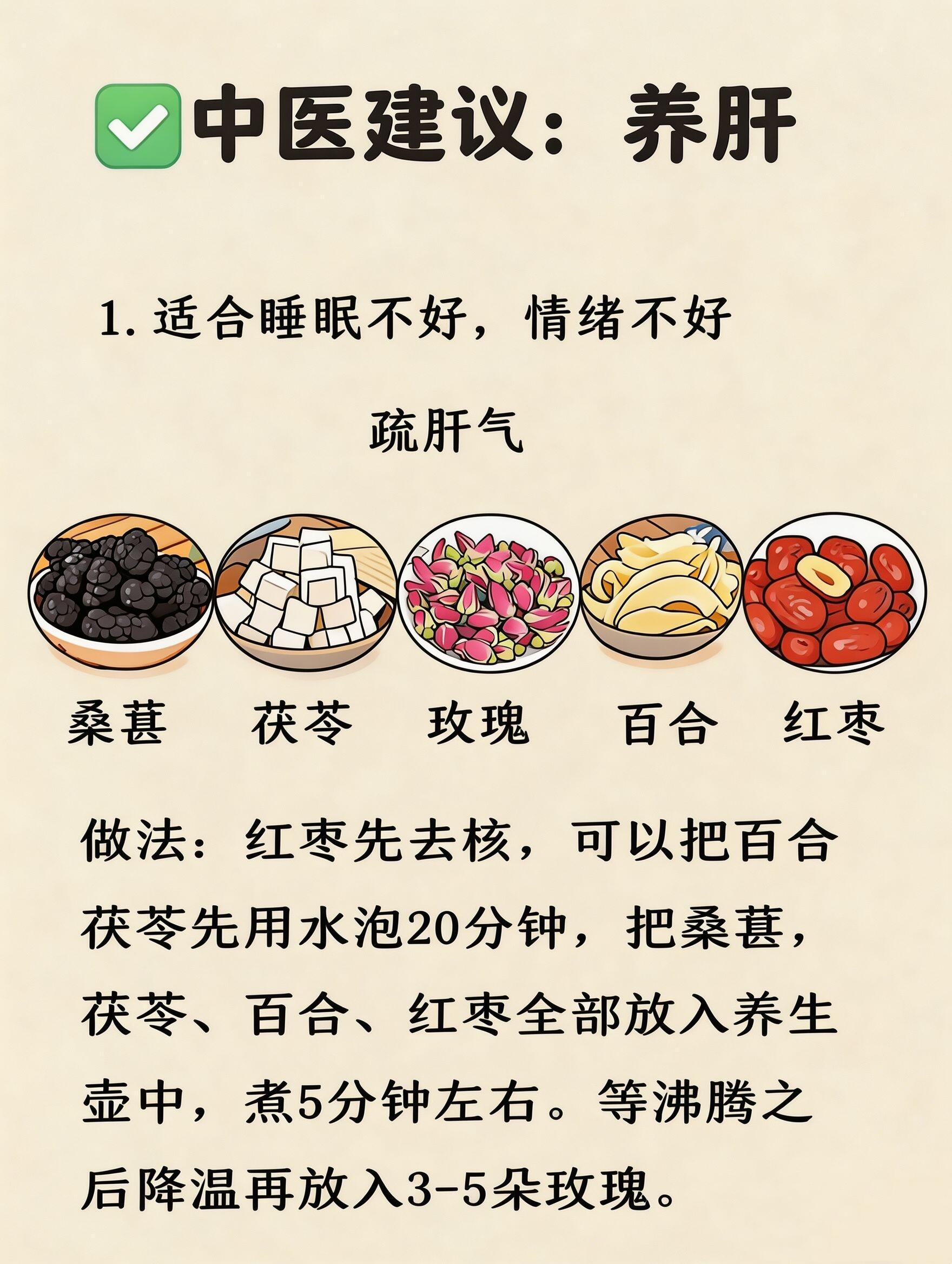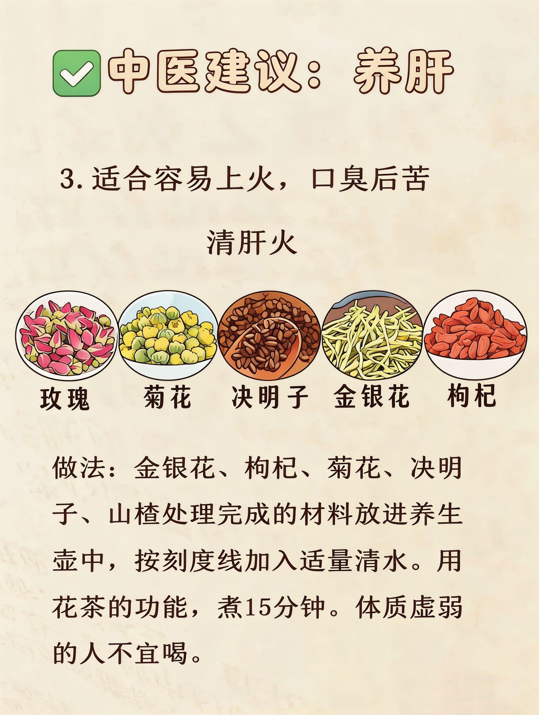 惊蛰到,阳气升,万物复苏🌱中医说“春气通于肝”,这个节气正是养肝黄金期!肝不好,春困、烦躁、脸色差全找上门这4款养肝茶,帮你疏肝气、养肝血、清肝火、养肝阴轻松跟上春天的节奏,家人们也能轻松养生👇1️⃣ 疏肝气 · 桑葚茯苓玫瑰茶适合:睡不好、情绪差、压力大的姐妹✅ 食材:桑葚、茯苓、玫瑰、百合、红枣✅ 做法:红枣去核,百合茯苓先泡20分钟,和桑葚一起煮5分钟,降温后再放玫瑰✅ 功效:疏肝解郁,平复情绪,告别带娃emo2️⃣ 养肝血 · 桂圆枸杞玫瑰茶适合:经常熬夜、眼睛干涩、气血不足的姐妹✅ 食材:桂圆、枸杞、玫瑰、红枣✅ 做法:红枣+桂圆先煮,快好时加玫瑰和枸杞✅ 功效:补气血、润眼睛,熬夜带娃也能元气满满3️⃣ 清肝火 · 菊花决明子茶适合:容易上火、口臭口苦、用眼过度的姐妹✅ 食材:玫瑰、菊花、决明子、金银花、枸杞✅ 做法:所有材料煮15分钟⚠️ 体质虚弱的家人们慎喝✅ 功效:清泻肝火,口气清新,告别春燥烦躁4️⃣ 养肝阴 · 石斛麦冬西洋参茶适合:手脚发热、口干舌燥、阴虚火旺的姐妹✅ 食材:麦冬、红枣、石斛、枸杞、西洋参✅ 做法:石斛和麦冬先煮40分钟以上,胶质越浓越好,其他食材后放✅ 功效:滋阴润燥,缓解春燥口干,温润滋养💡 养生小贴士:- 养生壶一键操作,省时省心,工作时也能轻松养生- 根据当天状态灵活选择,不用每天都喝- 春天是调养身体的好时机,别只顾着照顾家人,也要记得给自己泡一杯茶,好好爱自己呀❤️国医的精诚力量惊蛰