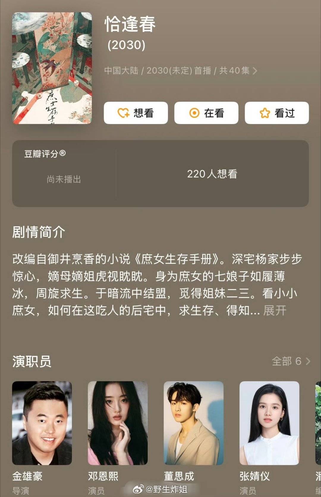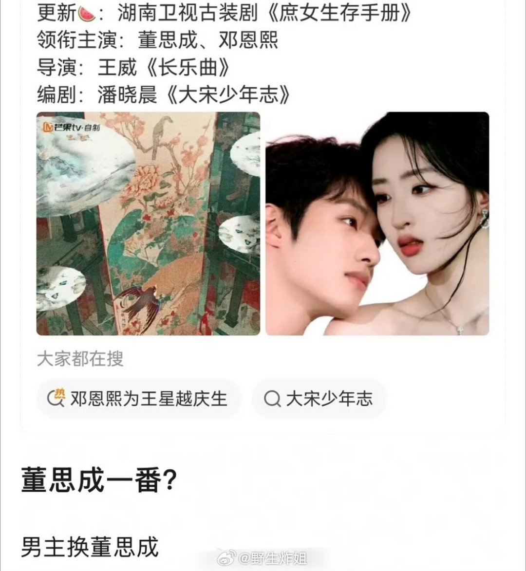 网传,董思成跟邓恩熙将要合作新剧《庶女生存手册》,董思成还是一番啊,看来李飞这给