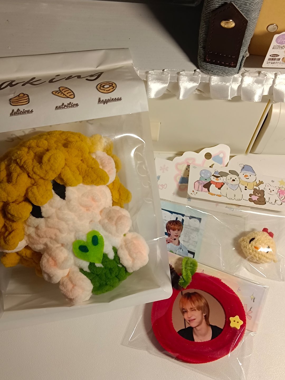 看到实物真的幸福的说不出话宝宝寄来的物料手真的好巧啊好厉害,织勾怎么那么好!最可爱最可爱的小面包金金,外星人👽衣服正好也是请回答和再世逢的造型,看见它就想到金金的killing part。很早很早就寄出了我现在才找到我先跪了