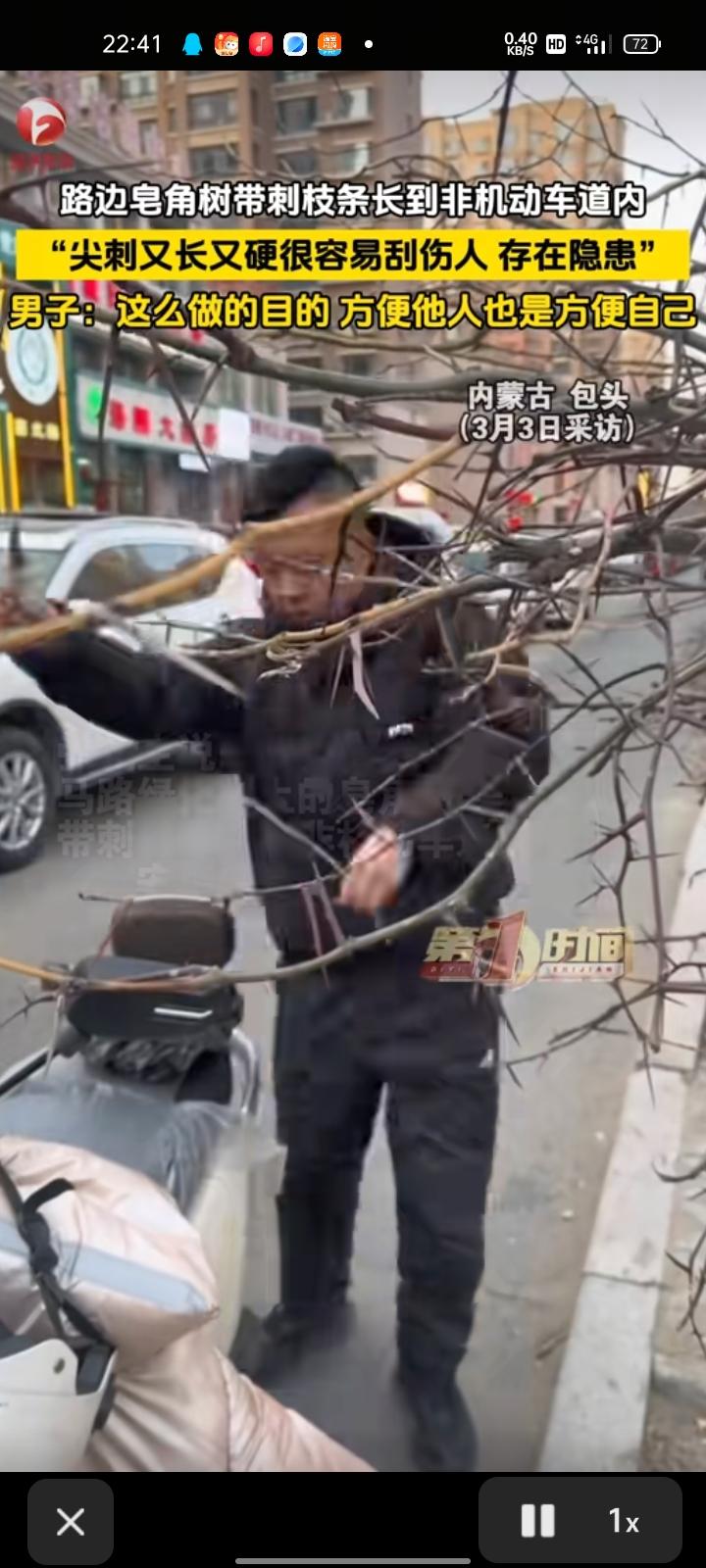 3月3日,内蒙古包头。张先生称,马路绿化带的皂角树枝条长到非机动车道内,尖刺又长又硬,存在安全隐患。于是,他拿着剪刀对带刺的枝条进行修剪,消除隐患,不仅为了方便他人,也是为了方便自己