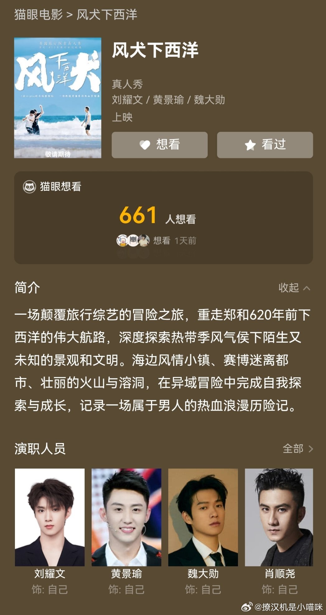 【节目类型】作为一档旅行综艺,《风犬下西洋》不仅展现了各地的风土人情,更融入了热血与挑战的元素,让观众在欣赏美景的同时,也能感受到嘉宾们的勇气与决心。【亮点介绍】节目中的七位嘉宾被誉为"Alpha 男",他们将在节目中展现出自己的独特魅力,共同面对各种未知的挑战。这场异域历险记不仅考验了他们的体力与智慧,更让他们之间的友情得到了升华。
