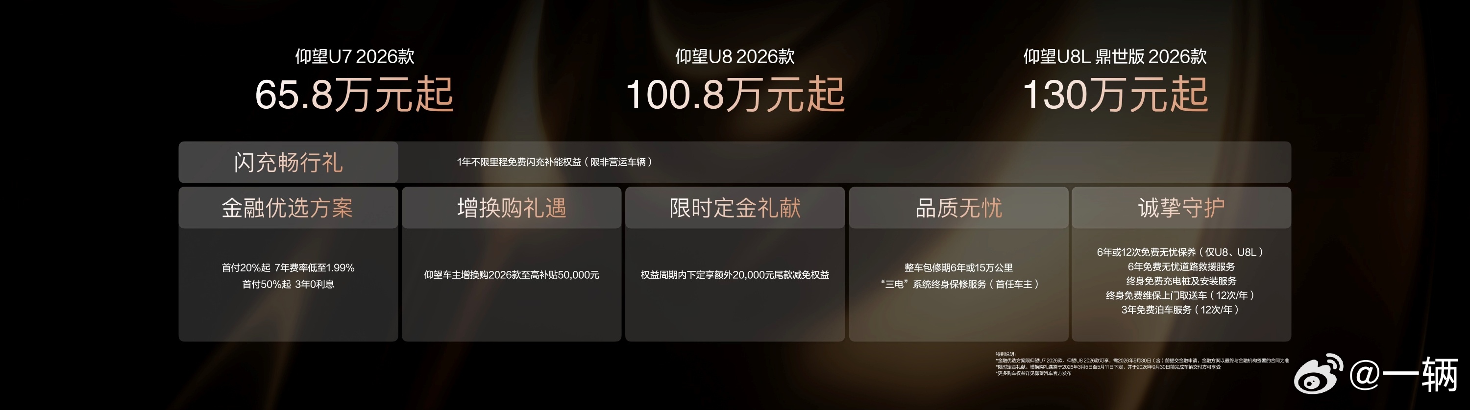 比亚迪的闪充技术发布会,又带出一批新车作为大哥的仰望,主销直接更新至2026款仰望U7、仰望U8、仰望U8L都得到了闪充仰望加闪充是一种强强联手的感觉5分钟充至70%,9分钟从10—97%这补能的感觉就特别的爽而且仰望还给这批车赠送一年的免费闪充权益…新车不仅仅是充电够快,还有综合续航能力的提升