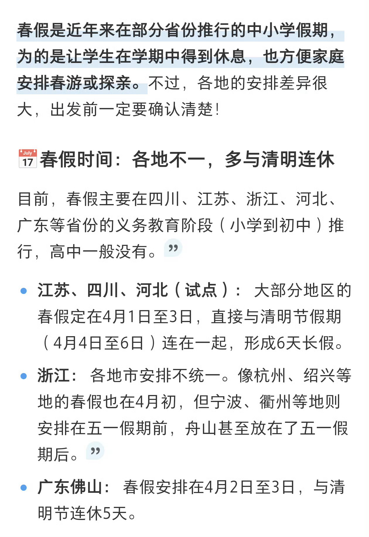 春假清明连休6天家长称很无奈 春假是个好事儿,孩子能更多的得到休息和放松,缓解精神压力和心情。不过呢,我建议有孩子的家长都可以共享春假,带薪休假,一起放假,带孩子和全家去旅游,促进消费,扩大内需!同意吗?