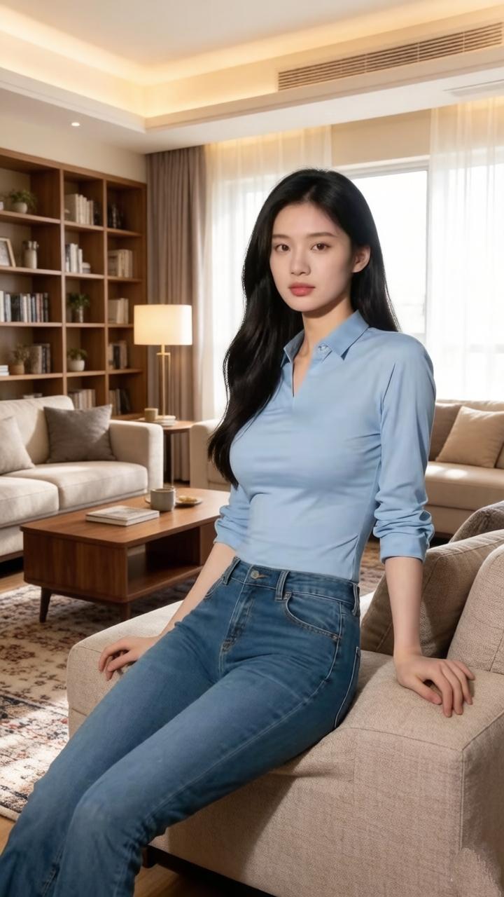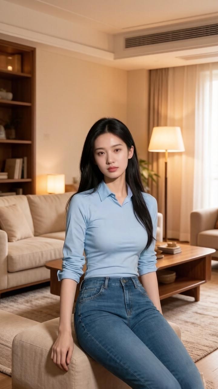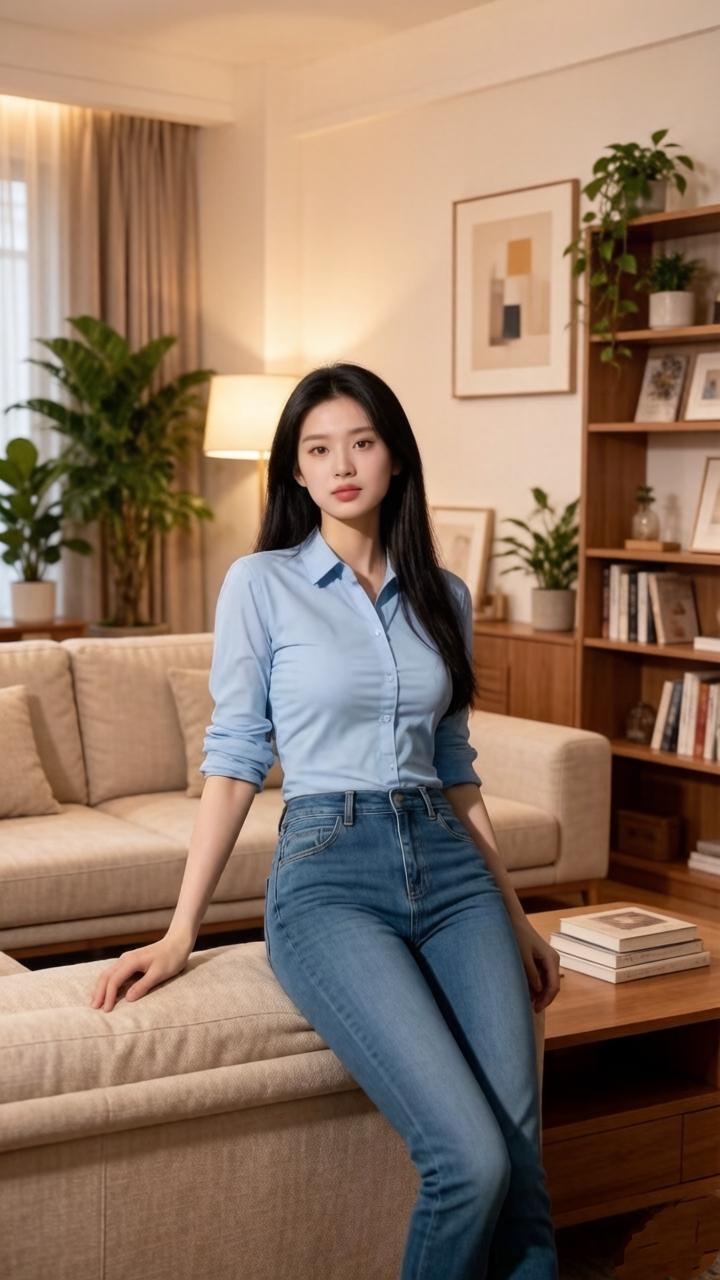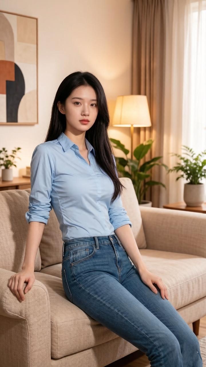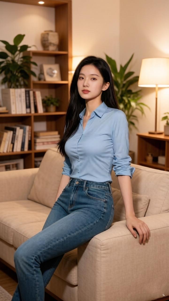 优雅蓝衬衫,牛仔裤,居家舒适风,自然光下,静谧美好。